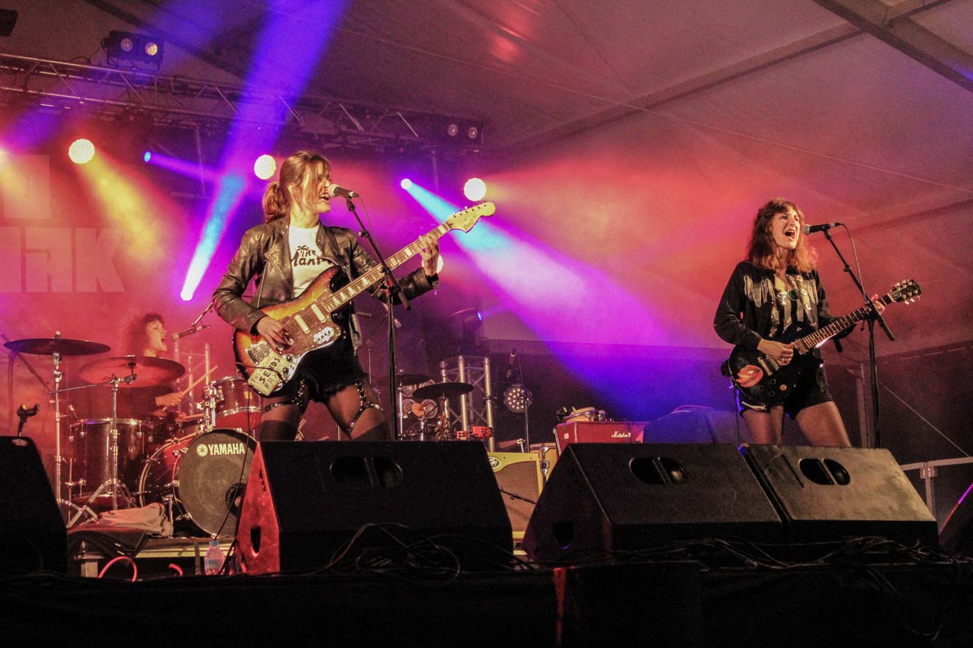 En diferido escuchamos esa zarzuela de la verbena de la Paloma. Aquello de «¿dónde vas con mantón de Mani- la?» de Concha Velasco nos abrió la mente. La carismática Mayka Makovski y su banda no se anduvieron con rodeos, desde el primer tema desplegaron su rock´n´roll, punkero con la esquizofrenia propia de artistas que no tienen nada que temer. Tuvieron momentos clave como cuando Makovski insinuó que tenía hambre y una bolsa de patatas voló hacia el escenario. Vimos y escuchamos las entrañas de la mallorquina con la boca llena de tubérculos. Cansada de un público que no les acompañaba en su despliegue de convulsiones, bajo a la pista de baile a calentar al personal y a animar a su propia banda. Solo puedo agradecer que existan artistas como ellas. La calidad instrumental de Mariana Pérez (Sonic Trash, Rubia y Cora Bloom) en los parches, Olaia Bloom (Las Culebras y Cora Bloom) y Makovski permitieron que el bolo pasara en un suspiro cabalgando entre las estrofas de “He´s got the power” o “She look so sexy”. The Exiters, L7… la verdad es que sería malvada la comparación. Ellas son The Mani-Las (foto inferior).