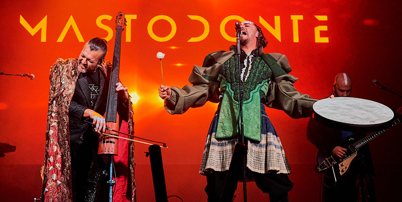 A las 22:20 aparecía Mastodonte en escena. El pabellón, que parecía excesivo, les ciñe tan bien como el atuendo extravagante con el que salen ataviados. La jornada, que desde Ganges hasta Cariño había ido creciendo tanto en número de artistas sobre el escenario como en instrumentos (de la voz casi desnuda de Ganges al power trío de Cariño) alcanzó su culmen con Mastodonte, que incluyeron hasta dos secciones rítmicas. El grupo combina a la perfección textos viscerales y melodías severas con matices tecno, dance y hasta funk, capaces de convertir lo intenso en liviano. Rompen el hielo con Glaciar, previa danza tribal en la que animaba al público con tambores. Asier Etxeandia, de un carisma apabullante y con una voz de una potencia dramática abismal, se erige en el maestro de ceremonias de un directo impecable. La complicidad con su compañero de escena, el multi-instrumentista Enrico Barbaro, y el resto de la banda, son una de las claves del gran directo. Como en una función teatral, los cambios de vestuario son frecuentes y en El Blues del Niño, Etxeandia aparece de repente con un gabardina: “Los niños me insultan pero las niñas no”. El público se mostró entregado desde el principio hasta el final, entusiasmado con las coreografías del frontman y la puesta en escena. Tras el último tema, Redención, uno de los más potentes, los fans en estado de catarsis abandonaban las primeras filas para cederle espacio a los nostálgicos del indie rock de los noventa.