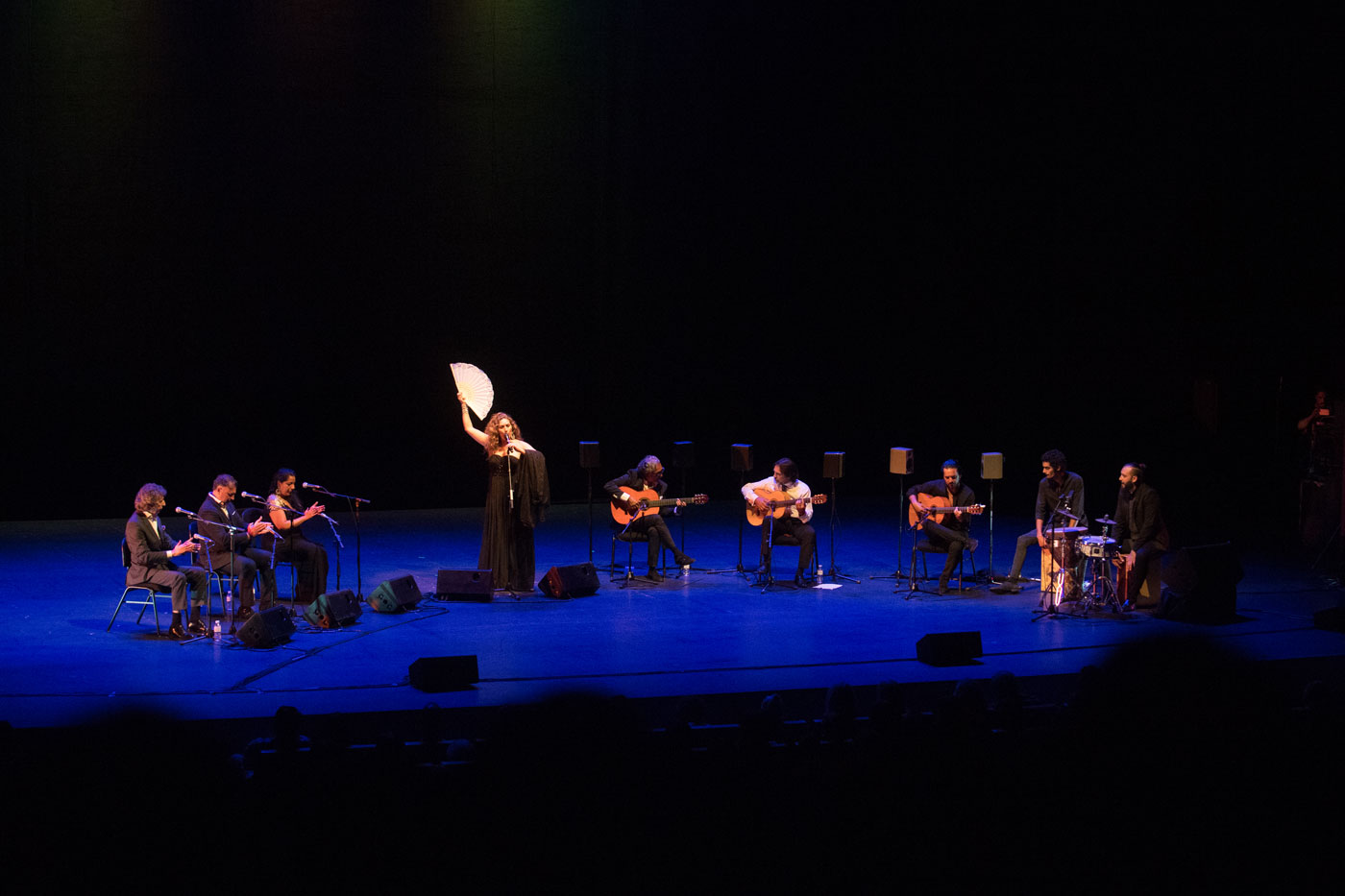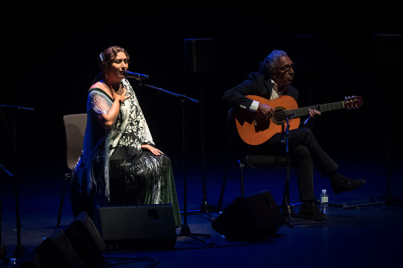 Del repertorio, para alguien que habla como un iniciado total en el flamenco, cabe destacar la larga interpretación a la guitarra de Agustín Carbonell que despertó un aplauso que se hacía presagiar eterno. Ya con Estrella de pie, y un espectacular vestido negro como la noche de Iruña, el respetable se deleitó con la nómada “Moguer”, se estremeció con la universal “Volver”, con la que dedicó el concierto a Mayte Martín, y se acabó de romper con esa interpretación de la “Pena de mi soledad” de Gracia Montes. Mención especial también merece esa “A Lola”, dedicada a La Faraona, que sirvió para conectar a dos de las sagas más importantes del flamenco y a un público de todas las generaciones mediante versos que son historia viva de este país.