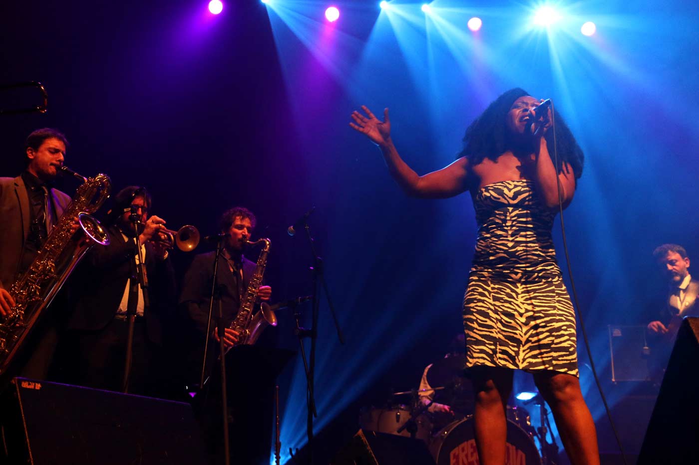 Del álbum en el que participó ésta última (el primero del grupo) sonaron sólo dos canciones, y es que no hacía falta más. Escuchamos “working class” así como “running to nowhere”, cantada por algunos de los asistentes. Del segundo lp sonaron unas cuantas, de las que destacaría la propia “dignity & freedom”, la creciente “begging you” o el coreable hit “you can´t stop us”, del que repitieron la parte más reconocible en el último minuto de la parte de los bises. Del esperado tercer trabajo de los de Madrid sonaron bastantes canciones, pero esto lo supongo por el desconocimiento que tenía de las mismas, no porque la banda se dedicara a hablarnos de ellas o sus títulos, tarea que seguramente deberían haber llevado a cabo para despertar un mayor interés en su nueva música y en éste esencial crowdfunding. Sea como fuere, las nuevas composiciones calaron en el público y lo pusieron a bailar cuando ellos quisieron y a disfrutar de las baladas y medios tiempos en otras tantas ocasiones; y es que si algo caracteriza a Freedonia es su decisión de unir temas rítmicos con otros más pausados e incluso con baladas aterciopeladas que otros muchos grupos de soul/funk desecharían o no emplearían en tal cantidad, seguramente por tratar de no decelerar el ritmo. A mí me parece algo importante y hasta necesario: pues, ¿qué es un concierto de soul sin sus varias baladas eriza bellos?