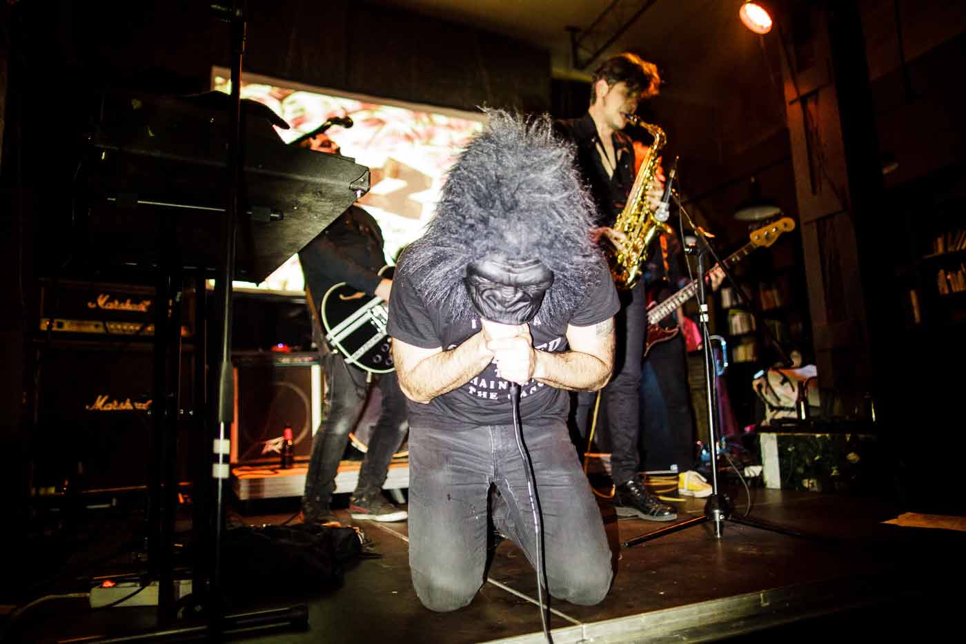 Y como la cosa iba de máscaras, las calaveras dejaron paso a la cabeza de un primate ocupando el lugar de la de JR Rioja, aullador y teclista de los bilbaínos La Hora del Primate (foto superior). Cabeza que apenas duró sobre los hombros el primer disparo, un “No tengo cerebro” que, junto a la salvaje “Perro”, acababan de estrenar digitalmente unos días antes para celebrar el festival. No era para menos, ya que la descarga eléctrica de la banda le hizo contorsionarse por el suelo de la sala en numerosas ocasiones, llevando en volandas el espléndido rugido que se producía a sus espaldas, reptante, insidioso, alcanzando cotas libidinosas de puro sucias o perfectos exabruptos de puro garage. El saxo, que hubiera merecido mayor volumen, confiere a La Hora del Primate posibilidades de salirse de los caminos estructurados y acercarse al más libérrimo rock’n’roll de alta energía, pero su mejor punto es que la fuerza bruta, que sin duda exudan, tiene que tener sentido para no ser simplemente eso. Y en ellos, todo lo tiene, incluso el objetivo de dejarnos anestesiados.
