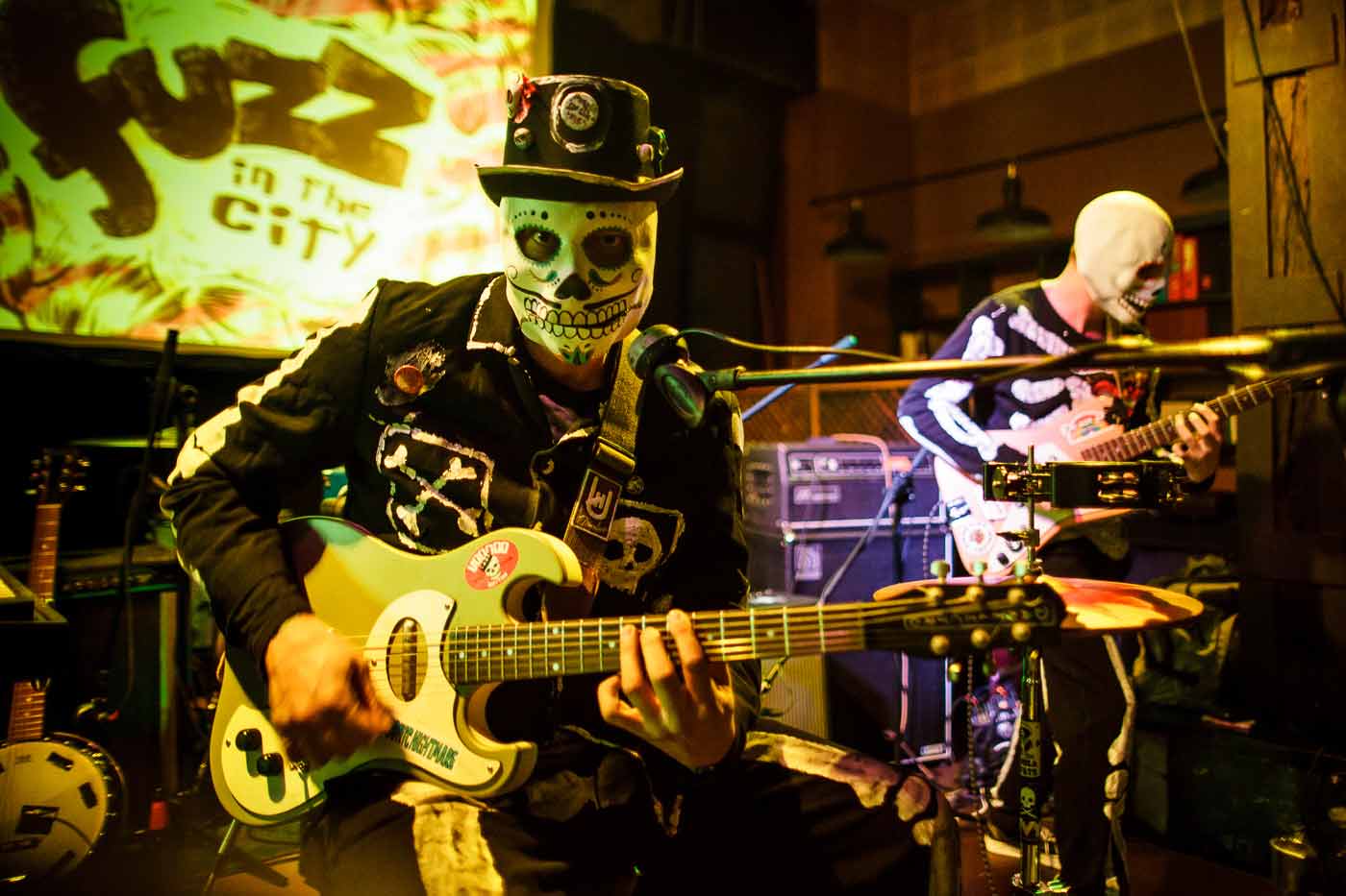 Así que perfecta apertura a lomos de los ritmos trotones del francés Tequilasavate (foto superior), que llegado desde Nancy Rock City, se hizo acompañar para el momento, como en las grandes y sucias ocasiones, por El Hijo Bastardo. Dos personajes con máscaras de calaveras y trajes de esqueletos, que rasgan guitarras desabridas y batería y percusiones contundentes para proporcionar una dosis tóxica de blues palúdico, garage de bote trotón, minimalista y repetitivo, con voces en puro reverb saliendo de las cavernas, surf sucio o arrastrados sonidos pantanosos más allá de las murder ballads. Cuando en “Lies” Tequilasavate tañe el banjo, uno no puede por menos que recordar el desasosiego que causara una película como aquella “Deliverance”, que parece tan cercana al cruce loco entre Cramps y Gories de la pareja, perfecta majarada para el comienzo de la noche.