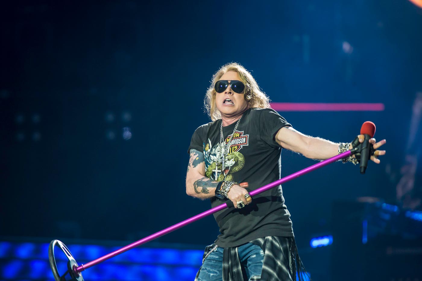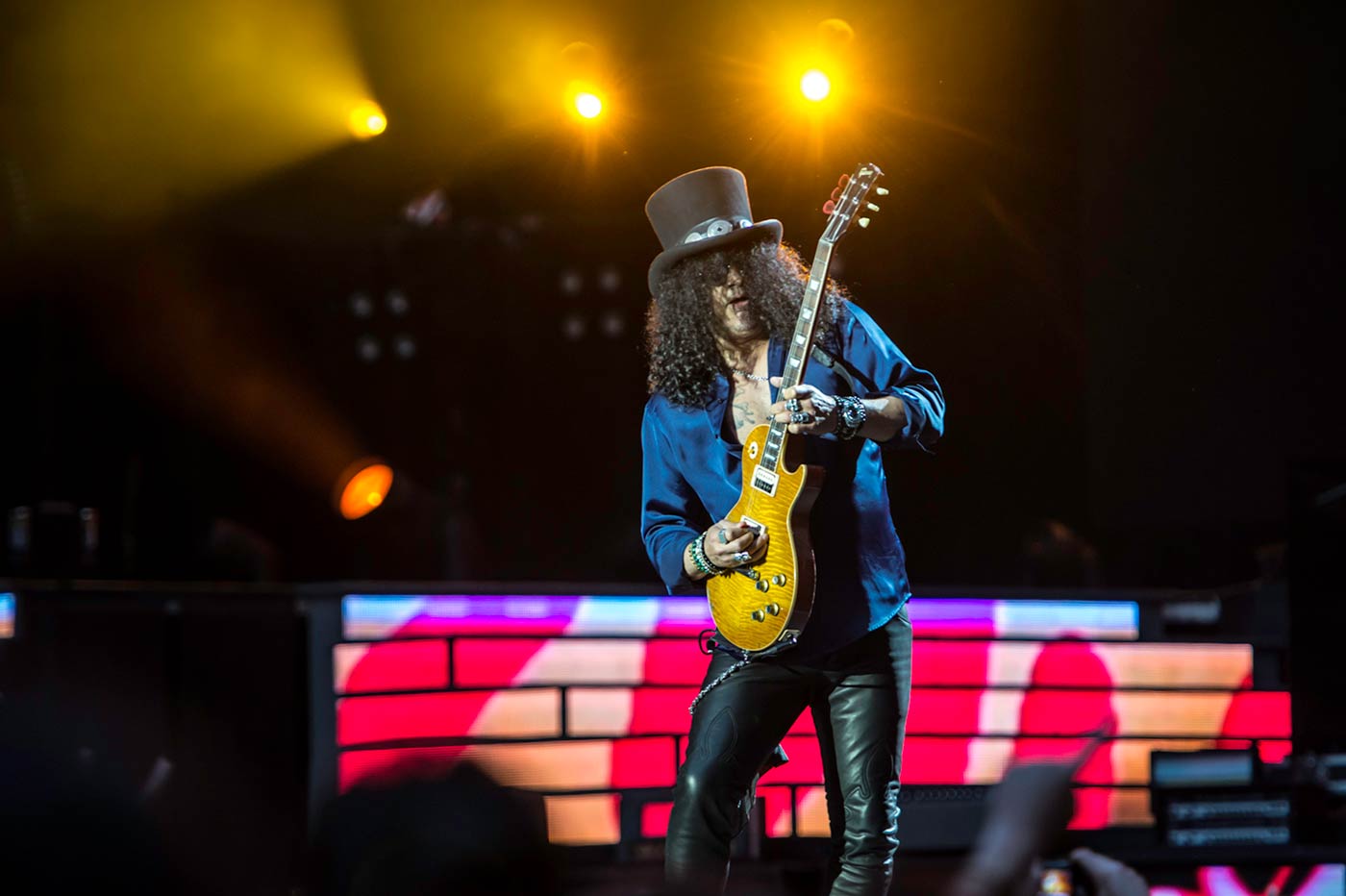 Por algún extraño motivo, han decidido sustituir del programa de esta noche muchos de los grandes clásicos de su repertorio por los discutibles no-éxitos de su “Chinese Democracy” y ahora toca “Better”, zurullo horripilante que suena como una Rihanna metalera en el baño del Viper Room. De verdad, deseo que alguien le gustara este rollo y lo disfrutara, porque Axl y su corista Melissa “llego-a-todas-las-notas-con-mi-garganta-prodigiosa” Reese se entregaron completamente en su interpretación. A Slash le daba igual, el había venido a puntear. Siguen “Estranged” y la primera de muchas versiones y guiños: “Live and Let Die” de los Wings. En el retorno al “Appetite” con “Rocket Queen”, Richard Fortus, curtido en mil batallas se rebela con un solo digno del mismísimo Satán (ya llevaba demasiado tiempo en segundo plano y lo justo es justo, el tipo sabe tocar) para dar paso a Slash, que sentencia con su talkbox. “You Could Be Mine” para poner San Mamés patas arriba y, en uno de los momentos estelares de la noche según mi humilde criterio, Duff toma el micro y se marca un pistonudo cover del “Attitude” de los Misfits, recordando que esta gente era punki antes de heavy o chicle-rock. Breve, pero eficaz. Si alguien aún no se había rendido aún a la banda, la épica “Civil War” cumple con este propósito estupendamente. Tocada exactamente como hacían hace 25 años, con el wah de “Voodoo Child” para salir, da paso a un emotivo homenaje al difunto Chris Cornell con un “Black Holed Sun” atacado a la perfección. Sabiendo cómo y cuánto los Nirvana y la escena de Seattle vacilaban a los Roses, es curioso imaginar en qué contexto un tipo excéntrico como Axl podia llevarse bien con el cantante de Soundgarden. En cualquier caso, temazo. Ya habíamos perdido la cuenta de las guitarras que llevaba tocadas Slash y los diferentes sombreros de su cantante al que, en estos momentos, le colgaban más cadenas de oro del cuello que a M.A. Barracus.