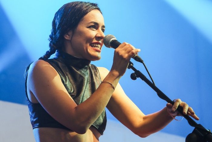 Los siguientes en subirse al escenario fueron la banda madrileña Jordana B. Con temas atrevidos y de gran reivindicación de género que engancharon al cada vez más numeroso público de Ficoba. Un estilo pop con guitarra, bajo y batería acompañaba a María Solá en este proyecto que empieza a ver la luz tras un verano girando en festivales de renombre cada vez más consolidados como el MUWI. Una actitud muy desinhibida y gamberra tocó techo de forma totalmente inesperada cuando la cantante se levantó el vestido para hacerle un calvo al público, que se quedó perplejo. Y es que Euskadi y en especial Gipuzkoa sigue siendo un lugar frio (como culo de pingüino), en el que cuesta horrores caldear el ambiente. Tampoco calentó del todo bien su voz María, ya que en algún punto del concierto le costaba más de la cuenta llegar a los tonos más agudos. De todos modos, las letras irónicas hicieron sonreir a muchos de los allí presentes haciéndoles pasar un rato agradable y muy divertido.