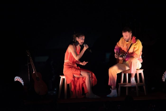 Con la novedad “Ventanas cerradas” saltó el primer invitado, Pedro Pastor, en un dueto de lo más exitoso donde la pareja inauguró la pasarela central para deleite de los fans. En esta canción, en la que Iker tocó la mandolina y Garazi la guitarra, empezaron los primeros botes por parte del público. Seguidamente Izaro presentó “Eskaleok”, una canción que al parecer han tocado una sola vez (y fue en México), y la interpretó en la pasarela central junto a Iker. La estupenda “Koilarak”, que abría su LP debut “Om” (2016) y que interpretó ella sola, nos recordó aquellos inicios que, objetivamente, no están tan lejos pero nos retrotraen a una época que presumiblemente nunca volverá. La reciente “Un poquito más” nos trajo un baño de realidad, la de los nuevos temas visiblemente orientados a las listas de éxito.