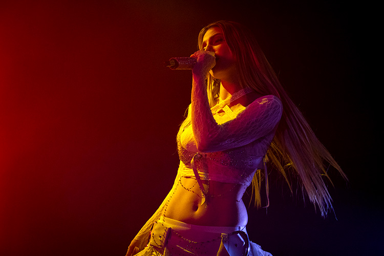 “Enamorada de tu” fue la segunda canción del concierto y cerró el primero de los nueve bloques con los que reorientaba los distintos momentos del show. Este reggaeton de la mano de Lowlight hizo entrar al público en un frenesí de euforia y cánticos que nos acompañaron toda la noche. “Apolo és casa meva, moltes de les històries de les cançons han passat aquí”, comentaba Julieta, emocionada de poder actuar en una sala tan emblemática como lo es esta. “Si ha de ser serà”, “Secr3t” y “Si tienes frío” siguieron esta historia de amor que apenas acababa de empezar. Así como en “Si tienes frío” se puso un abrigo de pelo, para la siguiente canción no le hizo falta nada más que su presencia y la coreografía de sus bailarinas para complementar la icónica canción de Patito Feo “Las divinas”.