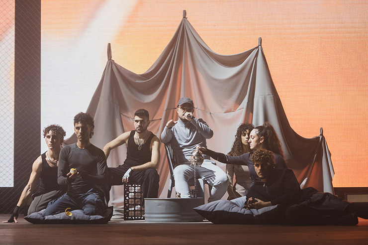 Una vez en el escenario, vuelta a la calma con un tema inédito Una gota y sentado a un piano de cola mece a las siete mil personas con la Nana del Miedo. Hasta en las últimas filas se guardaba silencio entre capela y capela. El sonido del Palacio, como siempre, expansivamente espantoso. Pero este era un concierto para verlo, y arrancaba el musical propiamente dicho y la Algarabía. Una escenografía entre Lorca, Saura y West Side Storie recreaba ese ambiente de barrio urbano. El Chino se calentaba al fuego de un bidón y empezaban a irrumpir en la plaza amigos y colaboradores. El primero el arquitecto del sonido Dellafuente, Antonio Narváez. Juntos se marcaron un DjSet. Por supuesto no podían faltar Pepe y Vicente el Vicio con los que Pablo repartió Flores, y Flores pa tu pelo.