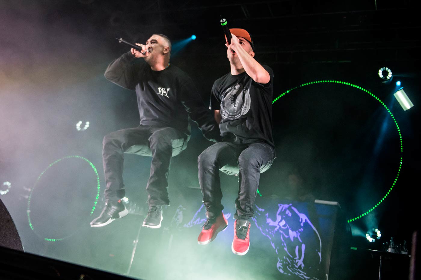 Pero hay más todavía. Kase.O se permite compartir protagonismo no solamente con el siempre efectivo R de Rumba, sino también con el mucho más joven El Momo, a quien permite moverse con total soltura por el escenario, protagonizar a capellas o tomar la palabra sin remilgos. Porque a nadie debe temer Kase.O cuando sabe que difícilmente haya quien pueda eclipsarle aquí y ahora. Por eso y porque el rap zaragozano siempre ha tenido mucho de família. De ahí que, de tanto en tanto, aparecieran por ahí invitados especiales como su colaborador Xhelazz, el mallorquín Hermano L, quien salió a reproducir su aportación a “Pavos reales” o unos Violadores del Verso que se reunieron al completo para darle a “Vivir para contarlo”, llevando la sala a su máxima ebullición. De su banda de toda la vida también recuperó “Pura droga sin cortar” o “Ninguna chavala tiene dueño”, al margen de “Javat y Kamel” (su aportación al primer trabajo en solitario de R de Rumba). Nos sorprendió incluso echando mano de “Chúpala”, aquel hit deslenguado que se marcó con Dogma Crew años atrás.