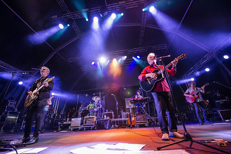 El reparto de clásicos infalibles siguió con otros dos hits, “Los Delinquentes” –con un gran solo de guitarra de Diego Pozo “Ratón”– y “El mundo de ayer”, en la que Ariel se encargó del solo. Porque esa es la línea argumental de los conciertos que estos dos sabios musicales de pelo canoso siguen en esta gira, disfrutar compartiendo esas canciones que forman parte ya de nuestro patrimonio cultural. Además, siguiendo el guion del programa, invitan a músicos para que les acompañen. Así, una de las colaboraciones estaba cantada. Muchachito apareció en escena, aunque le acompañaron los cinco vientos que giran con él. “Lo que me importa eres tú” sonó tremenda con esa macrobanda y nos contagió de la gran complicidad que existe entre Muchachito y sus mentores. A continuación interpretaron “Tu nombre”, ese precioso nuevo tema del de Santa Coloma, y cerraron la colaboración con la coreada “Sin documentos”.
