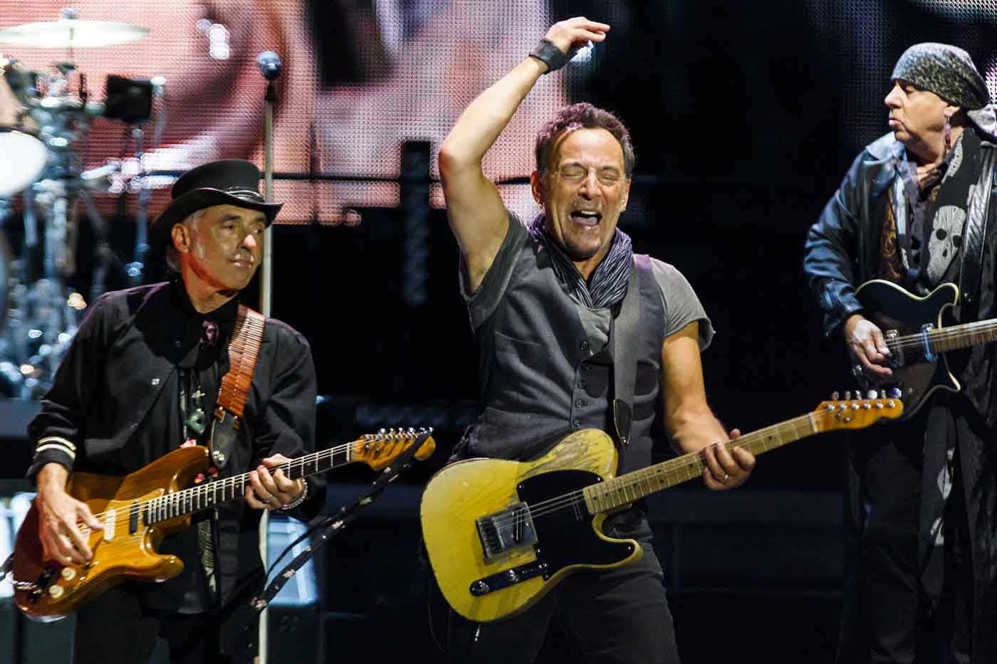 Lo mejor que se puede decir de esta gira es que la gente sale feliz, inflada de contenta al comprobar que, pese al paso de los años de músicos y seguidores, aún estamos en disposición de disfrutar del mejor Springsteen. El mismo que desapareció de forma algo abrupta y sorprendente a partir de “Tunnel Of Love” (1987) y que solo ha recuperado el pulso de su leyenda en momentos muy puntuales como cuando le dio por vindicar la figura de Pete Seeger y la tradición de la canción protesta americana. Un Bruce Springsteen que se vale de su legado más valioso, el compuesto por “Born To Run” (1975), “Darkness On The Edge Of Town” (1978), “The River” (1980) y como no “Born In The USA” (1984), para dejarnos noqueados en una nostalgia bien sobrellevada que solo tuvo algún problema de sonido al principio del show, pero que luego entró dentro de lo aceptable teniendo en cuenta las dimensiones del recinto, y lo diferente que puede ser tu apreciación del mismo en función de la localidad en la que te encuentres. Porque poco de eso les debió importar a las primeras filas que vieron como en repetidas ocasiones nuestro protagonista se acercaba hasta ellos para darse ese obligado y consabido baño de masas, además de aceptar regalos como un sombrero, peticiones como “Glory Days” en forma de cartel y subir a dos chicas para cumplir con el ritual al que obliga “Dancing In The Dark”.