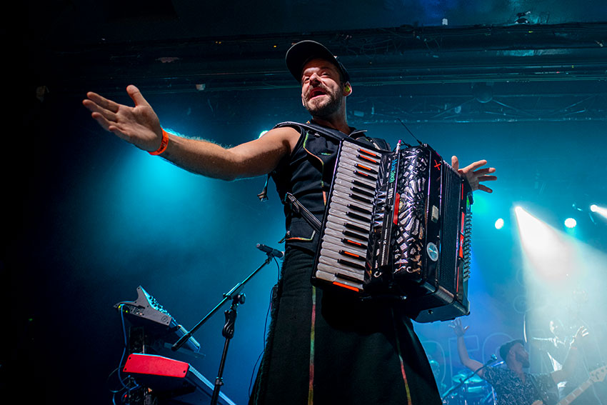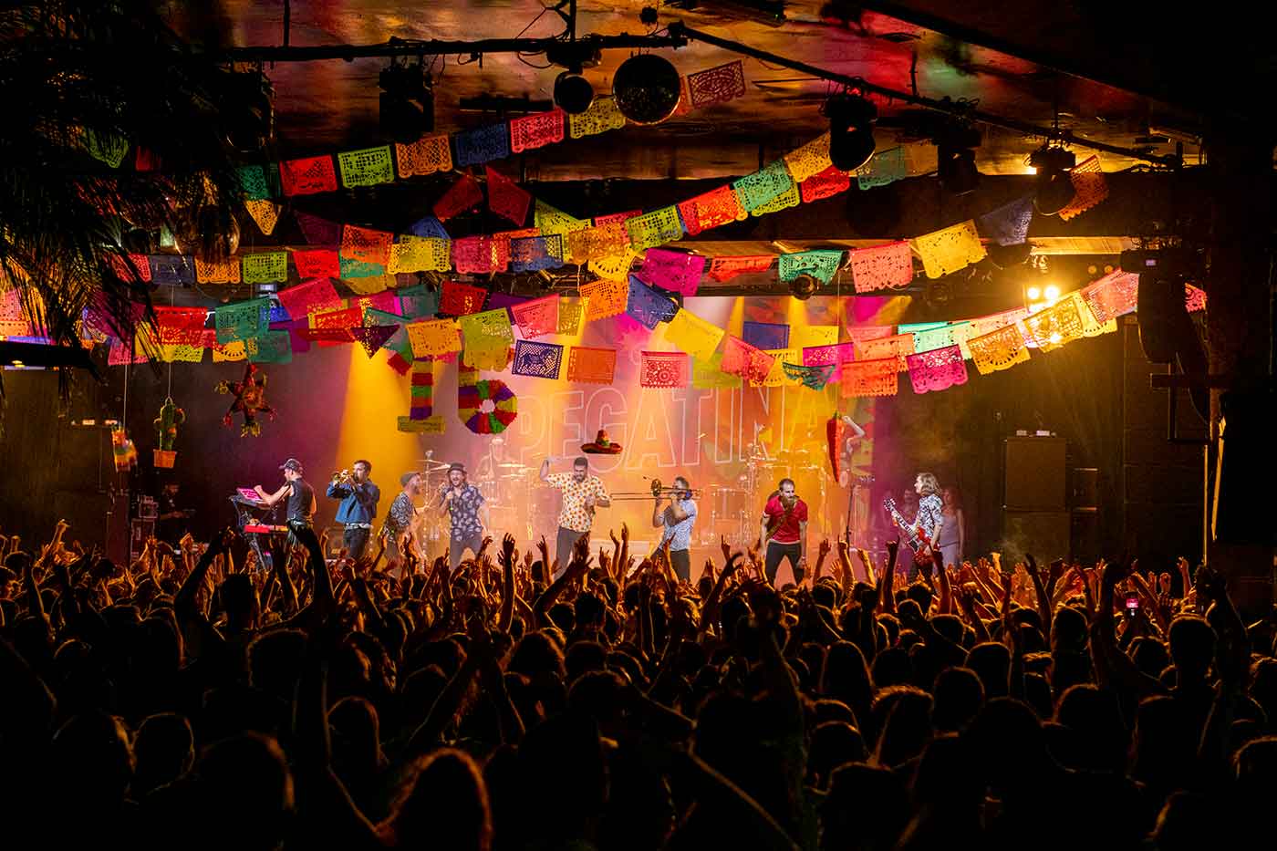 El cartel del “fiestón” lo anunciaba como entrada libre hasta completar aforo, pero lo cierto es que pocas opciones tuvieron quienes fueron sin la invitación que te otorgaba haber adquirido el disco en preventa. Dos colas (una por puerta) abarrotadas de veinteañeros llenaron las inmediaciones del Manzanares desde mucho antes de las 19:00h, hora a la que se abrieron los accesos. Y es que es indiscutible que los barceloneses han sabido romper la barrera generacional y calar hondo entre los más jóvenes. Una vez dentro, piñatas, banderines y hasta una estatua de una calaverita mariachi daban una bienvenida de claro acento mexicano.