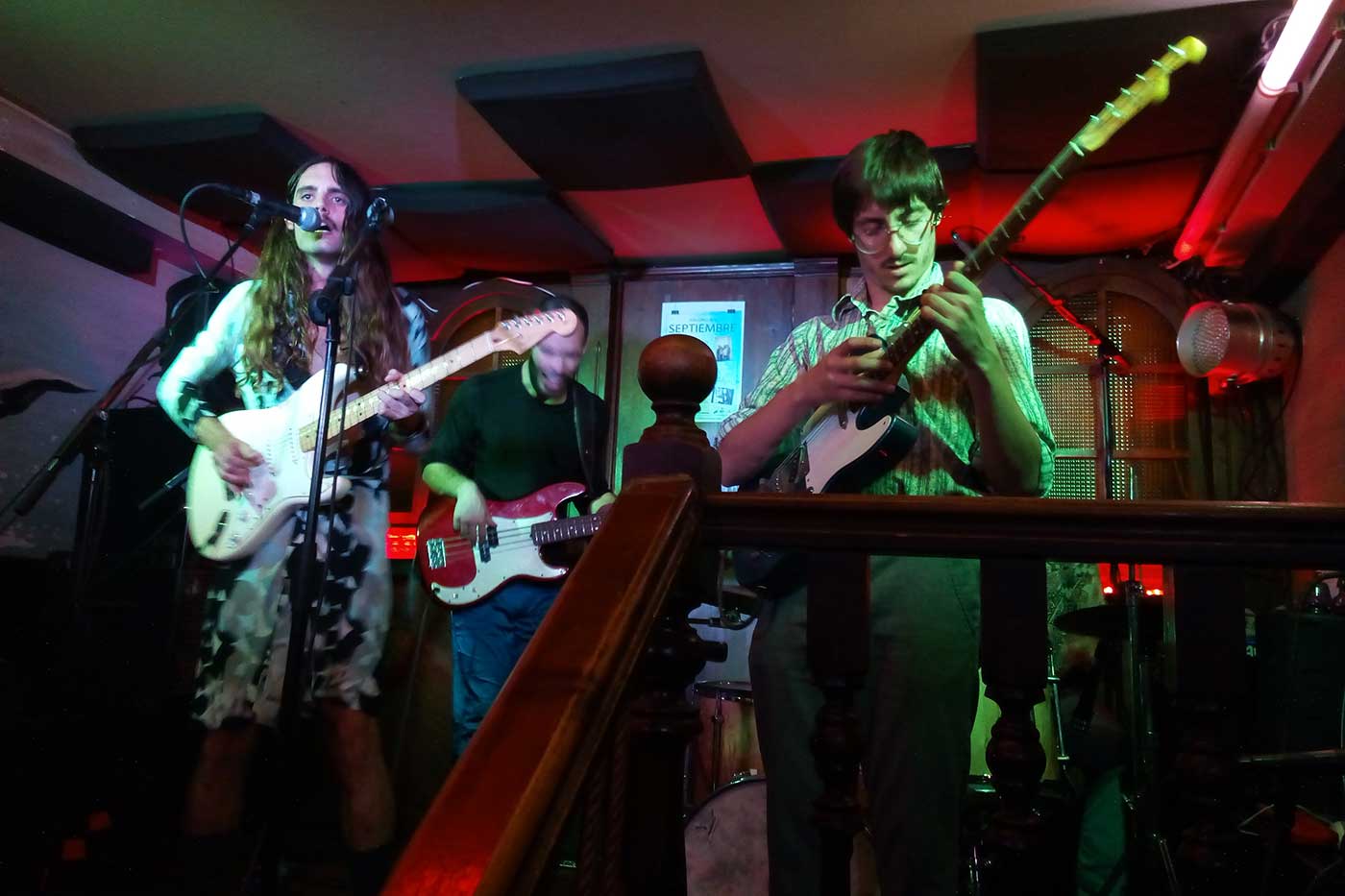 Esa es al menos la sensación que también dejó su segunda visita a la ciudad –ahora presentando el nuevo EP “Shit Dope” (Bankrobber, 18)–, en la que repitieron sobre el escenario del Avalon Café y donde se (re)encontraron con un público no demasiado numeroso pero suficientemente entusiasta, sobre todo una vez superada la toma de contacto inicial. La formación da impecable salida a su música, liderada por el arrojo de su excéntrico vocalista (y guitarrista) Pot Batlle –siempre teatrero y pintoresco en su ejecución-, en lo que se sucede como una mezcla indiscriminada y difícilmente clasificable. La electricidad de guitarras noventeras se entremezclan con ambientes propios de los 70 y de las óperas rock o los discos conceptuales, mientras que el kraut-rock, el jazz y la psicodelia también tienen su parte de protagonismo, además del habitual falsete de Batlle apuntando hacia el glam-rock. La miscelánea –tan compleja como hipnótica para el destinatario final– deja a su paso unas canciones plagadas de artistas y estructuras atípicas e irregulares que, pasadas por el tamiz de cuatro músicos compenetrados y solventes, pueden llegar a tornarse fascinantes.