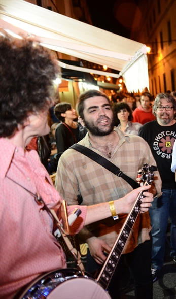 Había ganas de ver el nuevo hijo de Paco Loco, Dani Llamas y Juan Ewan, The Ships. Emulsiones rock a ritmo del tiempo y el espacio que los encuadray les pertenece. Tal vez echamos de menos un poco de capacidad de sorpresa, pero con propuestas tan honestas ¿para qué?. Ya que teníamos ganas de seguir con actitud y derroche, Juventud Juché nos parecía el maridaje perfecto. En un lugar con poca pinta de tener buena acústica (la lluvia obligó al cambio de escenario), los madrileños hicieron lo que mejor saben hacer: post-punk tropical con trazas de psycho-billy cañí. Iñigo Cabezafuego (en la foto) sabe hacer de todo y todo lo hace con sabor, y este año, acompañado por un violín y un batería, pues mejor todavía. Su pop universal de Iruña, su surrealismo costumbrista, sus mensajes sin fondo se desarrollaron entre el jolgorio del grupo y del respetable, que siempre agradece propuestas cristalinas y profundas como la del ex Atom Rhumba. Luego llegaron las decepciones: Maika Makovski en plan cantautora a la que le faltaba electricidad en su actuación en solitario, el grupo Siesta! al que le falta casi de todo y Delafe y Las Flores Azules al que le faltó haberse ido un poco antes en el único concierto del festival que se nos hizo largo. Anteriormente habíamos sido testigos de excepción de la última actuación de Ginferno y los saxos del Averno con ese sabor agridulce que tienen las despedidas. Cuesta aceptar que su propuesta única (entre The Pop Group, Jamiroquai y Goran Bregovic) se extinga en un momento en el que el extraterrestre de Kim Warsen se ha afianzado como el mejor frontman del panorama patrio con su mezcla de funk, surf, jazz, mambo y pop. Los que no paran de subir y esperamos que nunca se separen, son los murcianos Perro, que no tuvieron ningún inconveniente en destrozar cualquier convención y desplegando en gerundio su paleta de recursos vitales y artísticos: Fagotizando referencias, demoliendo pamplinas, armonizando el caos, supurando (buena) literatura. La doble batería de Aaron del Sol y Fran del Valle fueron resucitando el cuerpo y el espíritu de un cancionero rico en matices y autenticidad que tuvieron sus puntos culminantes en “Marlotina” y “En bicicleta”. Los gallegos de Unicornibot nos dejaron la sensación de que no hace falta decir nada para decir muchas cosas, que el post-rock y el hardcore son necesariamente compatibles y que si se tiene bases (rítmicas) puedes construir cualquier melodía descomunal y poliforme aunque el horario intente derribarlo todo.