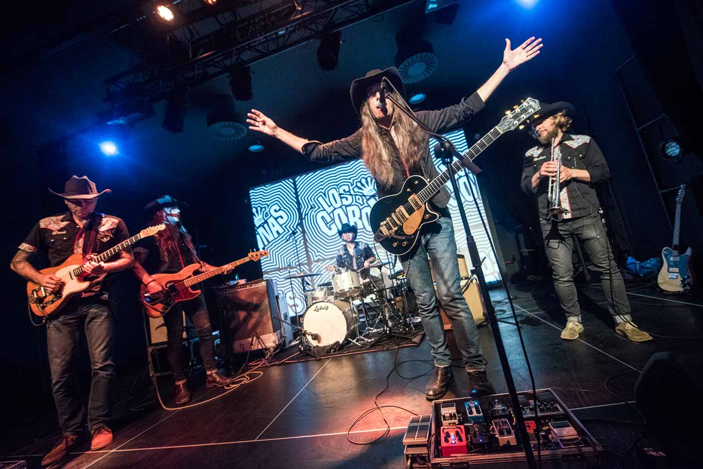 No cabía un alfiler ni de canto en la sala Kutxa Kultur Kluba, donde Los Coronas alardearon de poder de convocatoria en una jornada saturada de conciertos. Ataviados con camisas y sombreros vaqueros de color negro, los madrileños regresaban a Donostia para presentar su último trabajo, "Señales de humo" (2017), un doble álbum que repasaron a conciencia durante cerca de dos horas de rock instrumental, sudor y mucha diversión.