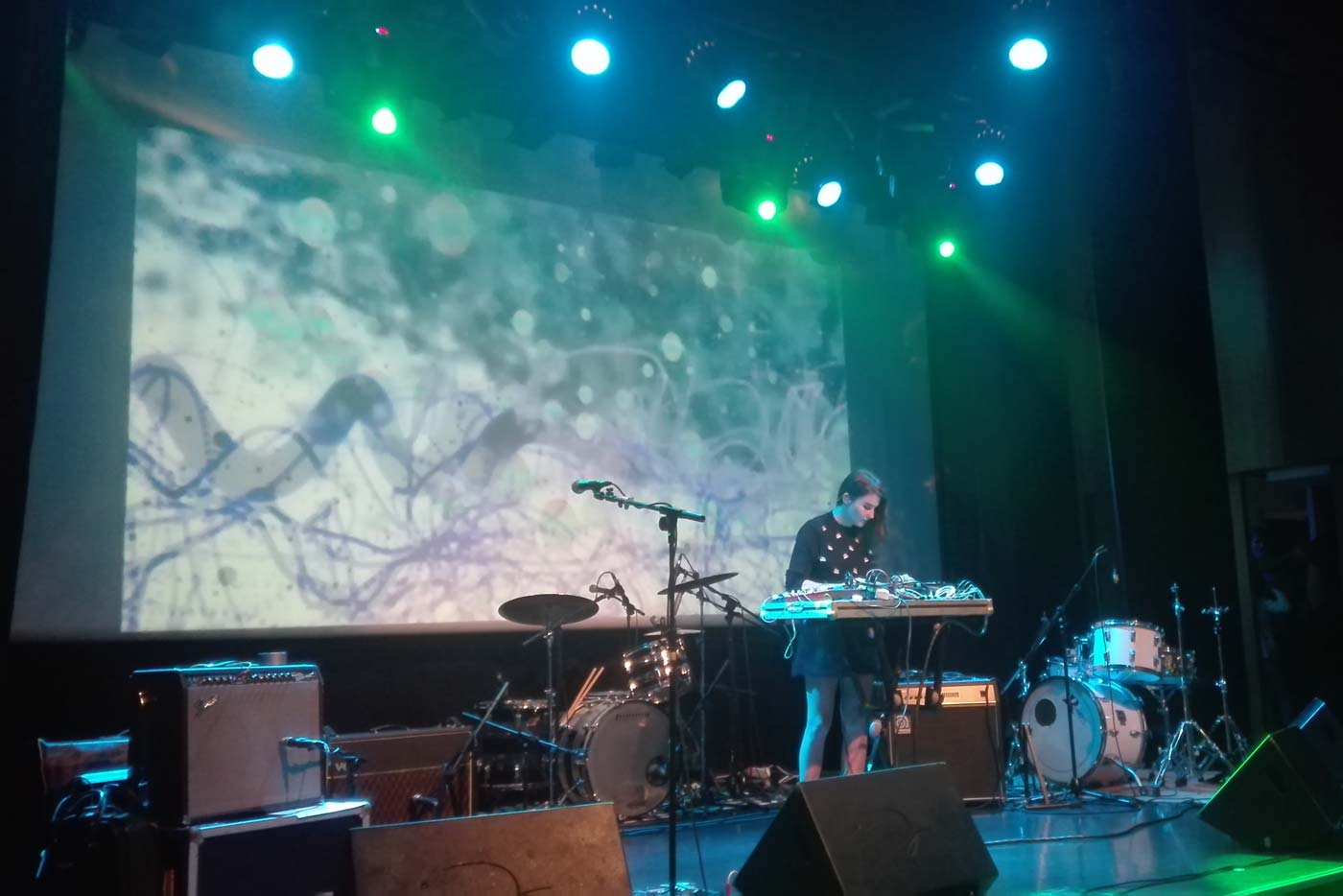 Cuando se dispone tras su mesa de operaciones, nos preocupa el impacto que pueda tener verse en la comprobación de que se está asistiendo a un evento en el que la palabra “minimalista” adquiere su máxima expresión. El público es escasísimo. Pero Aries se desquita, ella es autosuficiente. Empiezan a retumbar los graves en nuestro interior y enseguida encandila al público. Me apuntan que suena como Grimes y es cierto, desarrolla un pop colorista con sonidos electrónicos, ambientado con la proyección de imágenes evocadoras que nos acompañan todo el viaje. Hay que apuntar que se le podía haber dado mejor sonido, más teniendo en cuenta que estábamos en una sala que muchos envidiarían y sin embargo su voz se perdía entre el ruido.