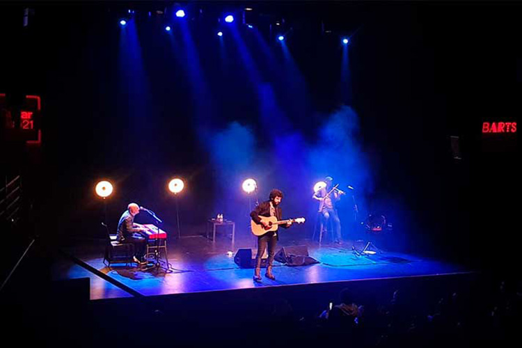 Marwán saltó al escenario de su primer pase en la Sala Barts con ganas de no perder el tiempo. Apostó por una puesta en escena minimalista, simplemente con unos focos detrás y el escenario lleno solamente por los músicos y sus instrumentos. El artista nada más salir empezó a entonar los primeros acordes de “El viejo boxeador” con su guitarra junto a sus dos acompañantes, Alejandro Martínez al piano y Marino Saiz al violín y la pandereta.