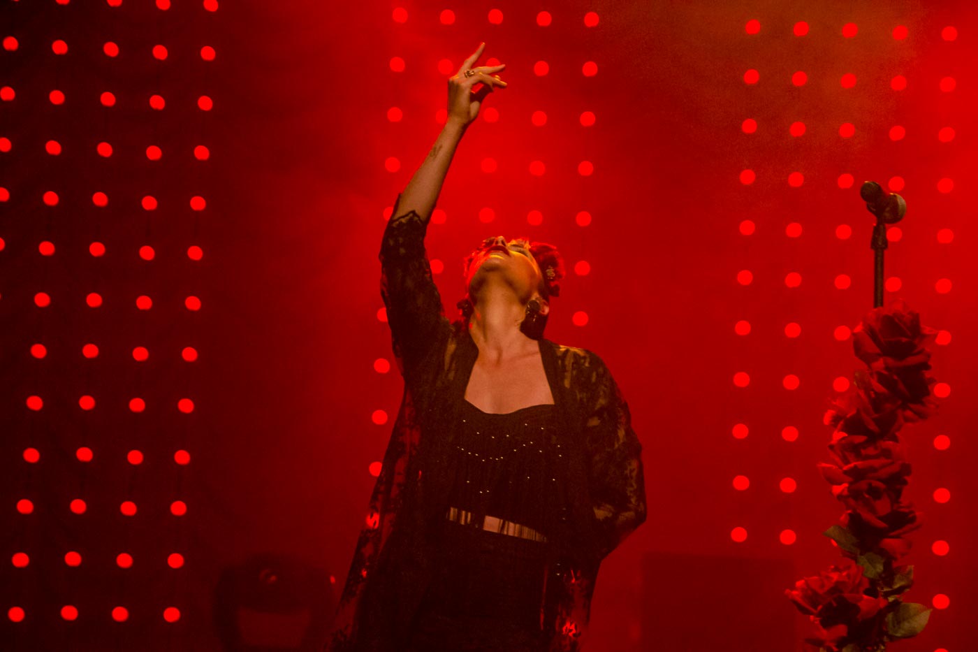 El espectáculo estaba servido con Fuel Fandango. El público, aunque tímido al principio, abarroto la primera fila de la sala con saltos, bailes y cantos. Por supuesto Nita, tuvo que participar y en numerosas ocasiones se acercó a los espectadores encaramándose en las estructuras auxiliares de la sala. Pasión en vivo y en directo. El escenario se llenó de flores y no pudo faltar un tablao flamenco que terminó de matizar el estilo de esta banda de consistente y ascendente trayectoria en el panorama musical nacional.