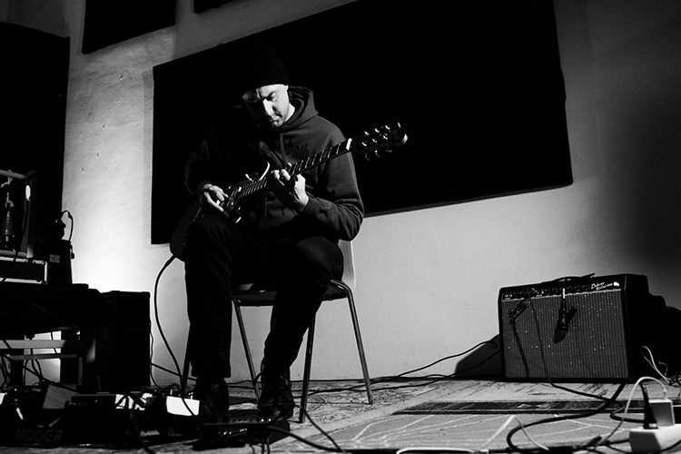 Mikel Vega (en la foto) tomó el relevo con una actuación de densidad y precisión notables. El músico vasco desplegó un universo sonoro que se mueve entre la guitarra procesada, el drone y la electrónica, y que en directo adquiere una dimensión orgánica y envolvente. Vega construye sus piezas por acumulación y transformación, generando viajes en forma de canciones —¿?— que avanzan lentamente, cargados de tensión emocional, hasta que finalmente explotan.