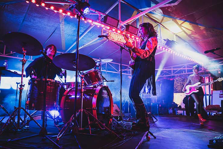 El sábado comienza con ibuprofeno, Batalla de bandas al sol en una Plaza Alfonso X abarrotada (se lleva la botella de Anís el Mono Ortiga) y vermut en mano, seguido de almuerzo felliniano rodeado de buena gente en una asociación flamenca que nos recibe con los brazos abiertos, concurso de baile incluido, El Puerto rules. Así, entre papas aliñá, chicharrones y caldito del puchero que nos termina de resucitar, cogemos carrerilla y despegamos la tarde con nuestra querida Le Parody, en una Milwaukee llena hasta la bandera, desplegando todos sus conjuros luminosos y adivinanzas electrónicas sanadoras, empapadas de folclore y raíces futuristas (esas que exploró antes que nadie) con compás flamenco y ritmos tribales que funden a golpe de beat, dos trompetas y percusiones industriales. Recorren las pistas de su sobresaliente “Remedios” (24), de “Se clavan” a “Un remedio” lisérgico que saboreamos sin pensarlo y la alegría de ese “Blacaut” para que nos pille el fin del mundo bailando; pasando por “La puerta” del magnífico “Porvenir” (19), con Dalila sumándose al éxtasis colectivo electrónico, y una “Europa”, compañera de surcos, que cada vez duele más y ahonda en la vergüenza de un continente que mira para otro lado cuando sus iguales sufren y son asesinados. Sole, grande entre las grandes. Digestión hecha, toca volar para poder cumplir el plan de la jornada: De las guitarras afiladas del trío catalán Diamante Negro, con las primeras filas de la sala Padreo saltando y cantando cada tema, con momentos álgidos como el vaivén luminoso de “Club Caribe” o la efervescencia punk-rock de “Olvídate de mí”. Pasamos a la Plaza Alfonso X, de nuevo hasta la bandera, para dos de las actuaciones más destacadas del día, primero unos Juventude que salen enmascarados y hacen que suban las temperaturas y la fiesta en un show sin fisuras, con sesión de viento incluida y la banda al completo dejándose la piel y transmitiendo el disfrute sobre las tablas. Pop setentero, surrealista y kinki, con Ángel y Nico al mando, conectando con un público entregado para la causa/verbena de principio a fin, y gozándolo mucho en temas como “La motillo” y “Dicen de ti”. Si lo de Juventude se veía venir, nos llevamos una grata sorpresa con el joven y explosivo dúo Dear Joanne (en formato trío, acompañadas de batería), hijas bastardas de la movida madrileña que parecen haber cogido un DeLorean directo de los 80 al Puerto de Santa María. Cóctel molotov de punk-rock, garage, new wave y power pop, con mucha energía, actitud y cuidada estética, más balacera incontestable de pildorazos que impactan de pleno: De “Ella quiere tocarme el pelo” a “Benito el aparejador”, pasando por esa “Angie la ladrona” a tumba abierta o “Se niega a saludar”. Quédense con sus nombres, Eva Summers (voz y guitarra) y Ale Conde (bajo), y pónganse a salvo, Dear Joanne, fuego a discreción. Justo antes vibramos en el Teatro Pedro Muñoz Seca con la descarga punk y post-hardcore de los burgaleses Memocracia, y después nos despedimos de la Milwaukee con la puesta de largo de “Peach please” (25), el segundo largo del cuarteto internacional-lanzaroteño Drûpe, que conectaron con el público desde el inicio y subieron las temperaturas a base de enérgico rock costero-volcánico, con una rocosa base rítmica, torbellino de riffs y el poderío vocal y rock & roll actitud de su vocalista, Camy Myles, a la cabeza.