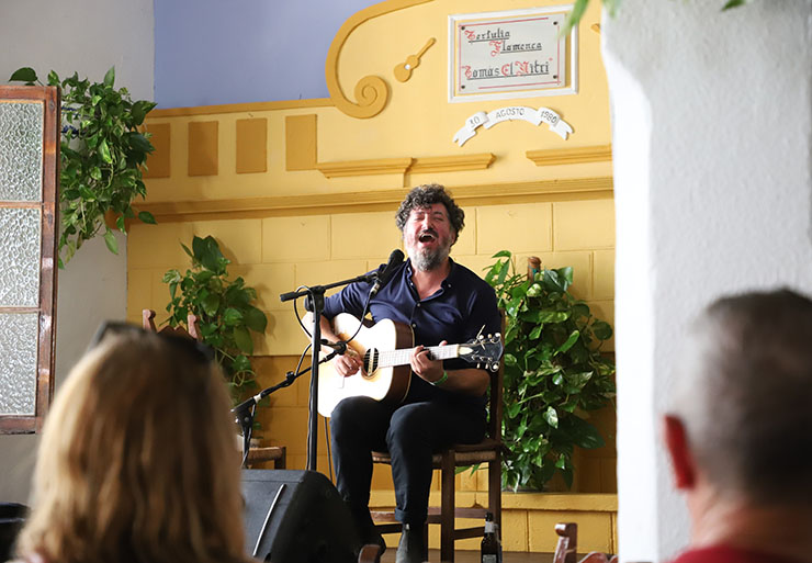 Sale el sol y no tardamos en, pasando el mediodía, desayunar vermut y luz de las entrañas de uno de los cancioneros más singulares del pop-rock patrio de las casi cuatro últimas décadas. Como uno de los ángeles caídos de la mítica película de Wim Wenders, “el cielo sobre El Puerto de Santa María” y aparece ante nosotros, en el patio del mágico Museo Arqueológico “El Hospitalito”, nuestro Nick Cave/Lou Reed albaceteño particular, Ángel Turbio o Fernando Alfaro. Con su aún humeante novela punk Mundo Turbio (24) bajo las alas, nos regala un sincero show gourmet abierto en canal, recorriendo el costumbrismo de sus páginas y de lo más granado de su discografía; de la personalísima crudeza de Surfin’ Bichos a Chucho, filtrado por el Alfaro desnudo de Sangre en los surcos (18), acústica en mano y a tumba abierta. Así, poco a poco, bajo un sol que comienza a abrazar y abrasar (una sombrilla/toldito que no rompa mucho la estética del lugar, para próximas ediciones no estaría nada mal, sobre todo para que los artistas no terminen fritos), Alfaro nos sumerge en su imaginario de amor, amistad, heridas, sexo, drogas, delincuencia, “santos mártires yonquis” (como cantaría esa alma gemela donostiarra, nuestro añorado Berrio) y rock & roll. De “El rey del pegamento” a “Mi anestesia”, pasando por “Ricardo ardiendo”, recuerdos con “Sangre en los surcos” y “Mi refugio” entre las olas del mar… Con pena, pero el corazón contento y la promesa de volver en la recta final (putada de solape), nos desdoblamos y vamos en busca del otro ángel caído de la jornada, nuestro querido Fajardo que, con esa descarnada poética que le fluye por su privilegiada garganta y una acústica que parece ser una prolongación de sus brazos, roja y negra lava corriéndole por las venas, tiene a la Peña Flamenca “El Nitri”, llena a reventar, en silencio total, con los ojos como platos y un pellizco colectivo en el pecho que se mantiene en el tiempo, en una actuación que, si te perdiste, ojalá tengas muy pronto la oportunidad de presenciar y sentir para siempre en tus carnes. “Todas las sílabas / nos dejan sin nada más /que decir…”, así nos deja Fajardo en cada fraseo, en cada susurro, en cada verso cincelado en el aire, quejío a quejío. Y el sol no se esconde, acude al canto y la luz se derrama por los ventanales de la peña y hasta los potos, más verdes y llenos de vida que nunca, trepan al son que marca José por sus “Mil muros”, seguido de esos “dos pájaros en un almendro” que, irremediablemente, me recuerdan a “los besos que tú me dabas”, verdiales enamorados (Morente bajo las alas) y folclore majorero que se hermana a la perfección. “Sobran palabras, no hay metas, sí abrazos” y seguimos las instrucciones: “Sentarse a escuchar, / contemplar / el milagro”. Una “Deidad” que corta la respiración y, de ese maravilloso Trecho (24) al natural que no nos cansamos de recomendar, una interpretación a corazón abierto de “Volcán” tras la que, si se hubiera acabado el mundo, a nadie le habría sorprendido. No faltó ese inicio que ya te atrapa y no te suelta, a capella, en pie y golpes en el pecho, cantos de los cabreros de Fuerteventura, y, claro, esa indiscutible joya de la corona, “Batalla vencida” que, para la ocasión, adapta la letra con guiño sanador: “Vámonos a la Peña El Nitri a reír, mata esta fatiga. / Y el dolor se desvanecerá…”. Y se desvaneció.