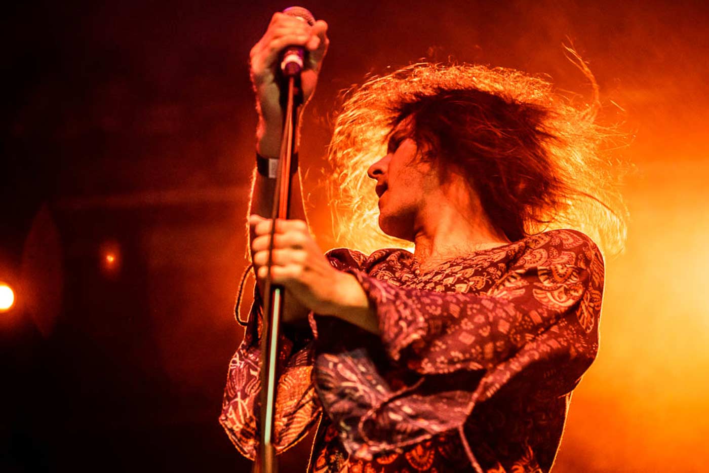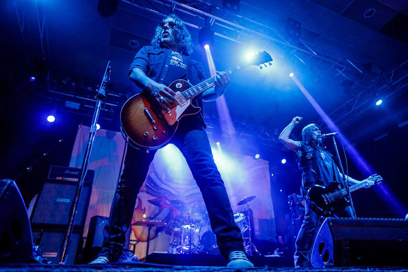 Ya en 2018, hace menos de dos meses se publicó “Mindfucker”: Un pedazo de trabajo que los devuelve a sus años de gloria. Para algunos es su mejor disco desde “Powertrip”, y aunque personalmente no lo pongo en duda, añadiría “Monolithic baby!” a la ecuación. Con estos precedentes, nos esperaba una actuación poderosa y anfetamínica donde, como se aprecia desde el comienzo del tour europeo, iban a darle cera al nuevo disco, con 5 temas interpretados de los 12 que tocaron. Saltan a escena y ya nos tienen ganados con “Dopes to infinity” uno de sus más monumentales temas de space rock, de su homónimo y aclamado disco de 1995. Seguidamente, el aplastante set de tres temas nuevos: “Rocket freak” (Hard Rock directo y básico, marca de la casa), “Soul” (sublime) y la propia “Mindfucker”, redonda y efectiva a más no poder. Dave sale pletórico, rabioso, como queriéndose desquitar de lo de 2008. Vestido con una camiseta del disco “Maggot brain” de Funkadelic, se comunica con nosotros, nos hace gestos; su expresión corporal y sus dotes de showman hacen el resto. Casi no toca la guitarra, pero canta y cierra los puños con decisión. No sobreactúa, pero está totalmente espídico.