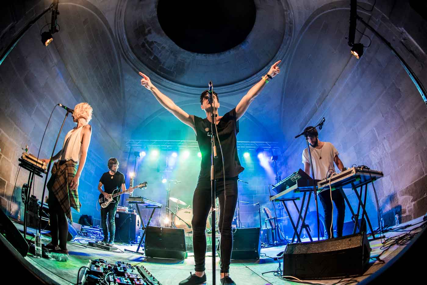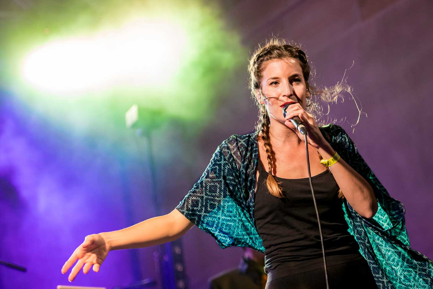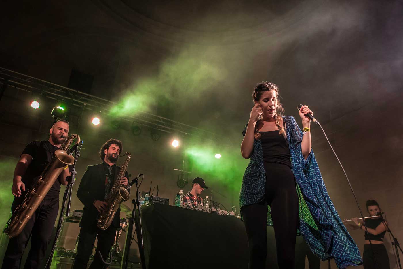 Pasadas las 23h subieron al escenario Iseo & Dododosound (foto superior e inferior) que llenaron de ritmos reggae, dub, trip-hop y jazzeros las ruinas vianesas durante 75 minutos. No es de extrañar que el dúo navarro tenga por delante un verano cargadísimo de actuaciones, muchas de ellas en festivales. Si con su segundo trabajo “Roots in the air” está consiguiendo subir ese peldaño para llegar a un público mucho mayor, con sus directos elevan su propuesta a cotas de intensidad y calidad mucho más elevadas. Así lo pudimos comprobar en su actuación del sábado con Iseo a las voces dirigiendo magistralmente una banda completada por una sección de vientos de cuatro componentes y, a los mandos de los ritmos y sonidos electrónicos, Dodosound. Un conjunto muy bien armado y con un potentísimo directo que tras su actuación se despidió por todo lo alto tras conseguir hacer bailar a todos los asistentes. Su álbum de debut tuvo gran presencia en un setlist en el que también repasaron su primer LP. Tras el inicio con “Frozen desert”, “Freedom y “Falling asleep”, temas de su debut, el dúo nos dejó “Zombies”, una de sus primeras joyas, con la preciosa melodía de trompeta que le caracteriza inundando todos los rincones de las ruinas. Ya de nuevo con toda la sección de vientos sobre el escenario y con una Iseo bailando y arengando al público sin parar, llegaron temas como “Digital shoots” y “Roots in the air” de su nuevo álbum, y “Cat platoon”, tema que da nombre a su debut y que fue tarareado por buena parte del público. La traca final llegó con “Fresh air”, que supuso el climax de la actuación con todo el público bailando gracias a las potentes breaks que Dodosound lanzó de bases en su parte final, y “Vampire”, el nuevo gran hit del dúo que engancha a cualquiera. Una actuación de notable alto que demuestra el estado de gracia en el que se encuentra la banda.