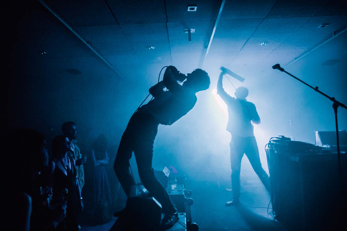 Lo cierto es que tampoco es sencillo tener una perspectiva clara de esas dos actuaciones con lo que vino inmediatamente después. La desbordante actuación de Damien Dubrovnik (foto inferior) lo cubrió todo con su magma corrosivo. 40 escasos y feroces minutos de ruido libre, a modo de performance confrontacional, con Loke desgañitándose y retorciéndose en torno al micro, y Christian golpeando sus “instrumentos” a modo de planchas metálicas con amplificación, contra las vigas de la sala, que sonaron creíbles, verdaderos y poderosos. Damien reventaron todos los esquemas preconcebidos que pudiera haber en torno al contenido y a la estética de este Festival. La sala quedó vacía tras la tempestad. Muda. Arrasada. Limpia. Feliz. Tabula rasa para buscar nuevos retos el año que viene.