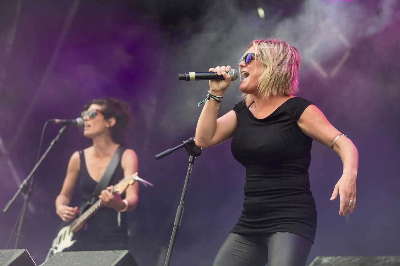 !!! (Chk Chk Chk) son los cabezas de cartel de esta primera jornada. Entusiasmo y ritmo frenéticos. Espectacular intro con la bailonga “NRGQ”. Melodía juguetona, espíritu disco. La pareja de baile formada por Nic Offer y Shannon Funchess se lleva todas las miradas, mas el teclista (Dan Gorman) bien merece una mención especial. Con sus gafas, su polo Lacoste y su apariencia de vecino algo rarito pero inofensivo, a ratos le da el siroco y se viene completamente arriba. Genial. El extravagante e hiperactivo Offer, con sus calzoncillos de sport y chaqueta de traje, parece un gogó febril y agitador de masas, que se lanza todo el rato al público, instando a que le sigan el ritmo (quien pueda). Lo cierto es que todo el mundo quiere bailar con él y contagiarse de su pura fibra óptica, sobre todo si suenan temazos pegamoides como “Dancing Is The Best Revenge” o “One Girl/One Boy”. Destacan sus falsetes –tiene mérito moviéndose tantísimo-, y la fuerza arrolladora de ella. Se van sin bises. !!! es el hijo bastardo del antiguo grupo de hardcore punkarra de Offer, The Yah Mos, lanzado sin remedio a la pista de baile.