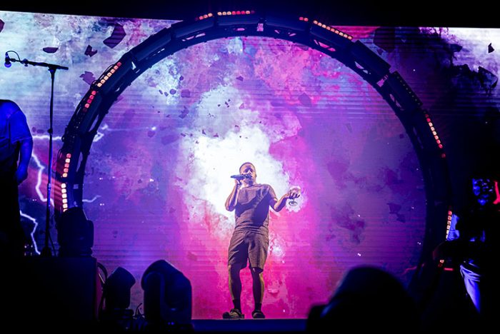 Despojados ya de máscaras y túnicas, los siete miembros de la banda se sitúan sobre un escenario en el que se encontrarán dispuestos en diferentes niveles. La batería elevada en la parte frontal a la izquierda, mientras que en el centro se sitúa una rampa que permitirá el flujo continuo de los músicos, aumentando el sentido dinámico del espectáculo. Todo ello enmarcado por cuatro columnas de luces semicirculares y una pantalla central redonda en la que se proyectarán unas visuales que engrandecerán el show que nos proponen los catalanes. Como en las grandes ligas. Sin embargo, nada de todo esto tendría sentido si luego no viene acompañado por un sonido a la altura del marco visual creado, pero así fue. La música de Oques Grasses se elevó fruto del delirio.
