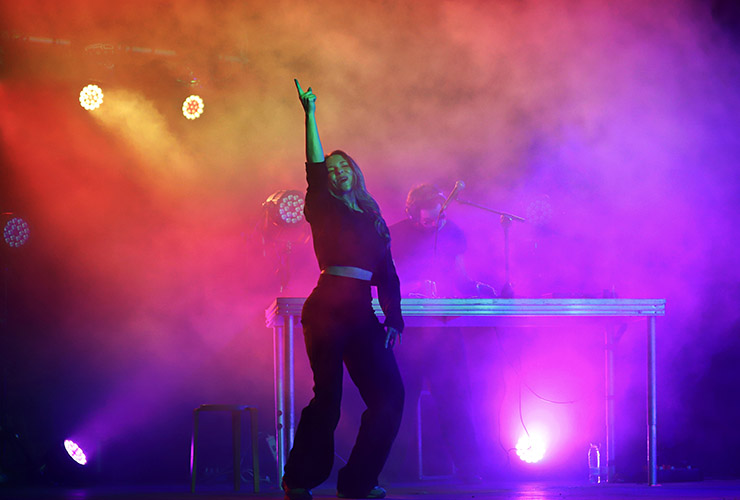 El show comienza con Bronquio en escena, a los mandos de la nave electrónica, expandiendo las hipnóticas e inquietantes atmósferas de “Paraíso. Cuántos cuerpos por venir”, con Rocío Márquez entonando a la perfección, fuera de plano, esa rompedora Milonga que abre “Tercer cielo”, pisando las tablas cual profeta caminando sobre las aguas, cruzando la bruma sintetizada que ese demiurgo jerezano teje con la naturalidad de su propio respirar y: “Cuanto más denso más blanco, / si es pensamiento, si es pensamiento… / Como los falsos amores / que se clavan en mi pecho, / como los mismos amores…”. Ya en sus redes y pellizco colectivo en el pecho. El duende y el compás sigue su paso en la alquimia lorquiana de zapateados, palmas y beats electrónicos de la juguetona bulería “Exprimelimones”, vibrante y resplandeciente oscuridad que funde y se libera por (ra)verdiales, otra de las masterpiece del disco, una “Niña de sangre” que vence el miedo y la herida, con Rocío y Santi provocando el primer gran movimiento sísmico en Hondo, con ese “motivo profundo” guardado y compartido, “por si se cayera el mundo”, con catarsis final y mantón girando en el aire como si fuera la última noche en la Tierra.