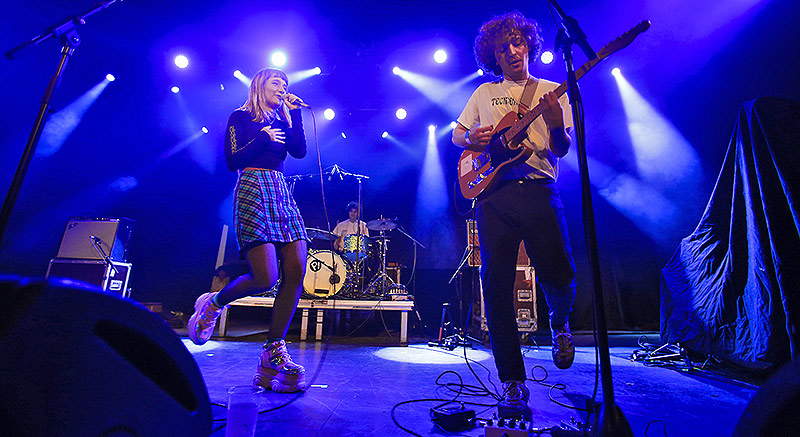 Ante una Riviera bastante vacía se encontraron Axolotes Mexicanos, hecho que no molestó a su cantante, Olaya. “El que no haya venido, se lo pierde”. Y a toda velocidad arrancaron los treinta minutos de los que disponían para afianzar el romance con los seguidores de primera fila y presentarse a oídos nuevos que fueron ocupando la sala a medida que avanzaba su set. El tiempo apremiaba y Olaya metió prisas a sus compañeros de filas para cumplir con los once temas del setlist. “¡Venga, Juan!”, le decía a su mellizo –encargado de la batería y más tareas ante la ausencia del bajo–, entre los pildorazos de Salu2 (2018) y Holi <3 (2015) sobre retrasos menstruales (Farmacia), calefacciones estropeadas (Menos 100) o rupturas recientes (Astor). Tribulaciones juveniles transmitidas con tal espontaneidad y frescura (equivocaciones incluidas) por parte de Olaya, que la asturiana se había ganado al personal nada más empezar y lo mantuvo enganchado hasta el final.