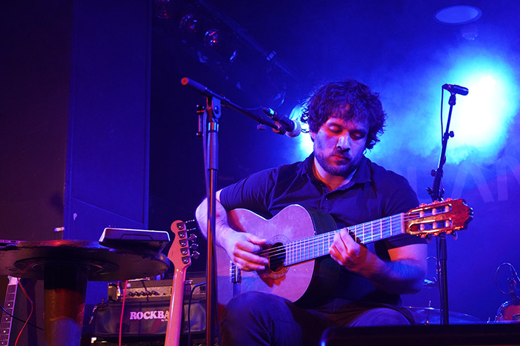 Entre el público se había congregado un auténtico quién es quién de la escena musical granadina. El espectáculo lo inició jai/egun, con una breve introducción a la guitarra y una melodía vocal sin palabras que, según explicó, pretendía ser un pequeño regalo: basándose en una antigua idea para una canción, trató de componer algo exclusivo para este concierto con letra en castellano, pero finalmente no le salieron las palabras en este idioma y se quedó en este primer bosquejo de lo que, probablemente, acabará siendo una nueva canción. Inmediatamente después, Aitor se puso en pie para entonar “Akapella”, acompañado únicamente de una percusión electrónica que, como si de un martinete se tratase, recordaba al sonido de un martillo golpeando un yunque. Su sombra recortada contra la oscuridad se alzaba imponente, mientras nos introducíamos en el tenebroso mundo de su música. A continuación, con “Berriz”, terminó de atraparnos gracias a sus furiosos guitarrazos, que nos fueron barriendo en oleadas de intensidad creciente.