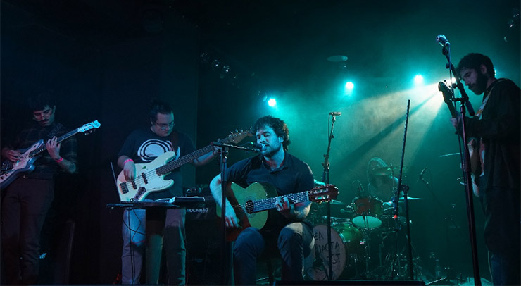 Tras diez minutos de pausa, Ramper volvieron al escenario, acompañados de sus colaboradores habituales en los vientos, para iniciar su concierto con “Nuestros mejores deseos”. En los años transcurridos desde que publicaran su debut, esta canción se ha convertido en un himno del post-rock patrio, y esta interpretación lo demostró: ante un público prendado de cada nota, la banda atravesó tormentas de ruido, pasajes dulces y calmados y crescendos magníficos con una fluidez y un control de las dinámicas impresionante. Ya desde este primer momento, se vio a las claras que el grupo llegaba con la maquinaria engrasada por la mini-gira primaveral en la que estaban embarcados. Pudimos comprobarlo a continuación, cuando tocaron “Día estrellado”, una canción nueva donde muestran su gusto por introducir diversos elementos de las músicas populares: no solo hay momentos en que la combinación de la batería y los vientos evoca claramente las marchas de Semana Santa, sino que incluso incorporan en un momento la melodía de la canción infantil “Vamos a contar mentiras”. De forma tan natural que ni siquiera sabría decir cuándo sucedió la transición, enlazaron el final de este tema con la segunda mitad de otra canción nueva, “Un miembro fantasma”. La banda al completo estaba volcada, llegando a un clímax brutal con flauta, trompeta y clarinete sonando a la vez y Álvaro cantando con una pasión inusitada.