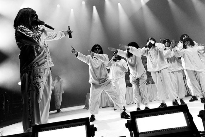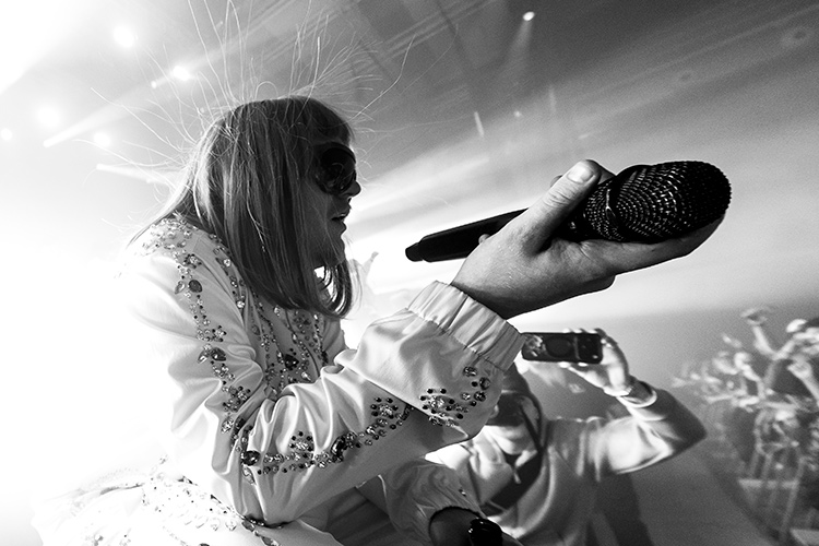 La flauta travesera de Drummie da el pistoletazo de salida a “Johnny Glamour” y ahí está rusowsky, de pie frente al micro, deslumbrante en ese outfit que Elvis se hubiera enfundado si alguna vez hubiera crackeado el FL Studio. Tras de él, una banda y decenas de backup singers vestidas exactamente igual que el cantante, como si de una especie de reinterpretación camp de los Oompa Loompas se tratara (¿no es el propio concepto de Oompa Loompa intrínsecamente camp?). Esta nueva puesta en escena, más coral, contenida y orgánica, hacen aún más sencillo valorar el talento escénico de rusowsky más allá de su ya más que reconocida energía cinética. Imposible no quedar impresionado por su inagotable registro vocal. La voz de Ruslán adquirió en el Sant Jordi Club una textura y versatilidad que, al menos yo, no había podido apreciar nunca de forma tan visceral, más aún si hablamos de sus baladas cibernéticas (¿cuántos clínex se habrán usado escuchando “4 Daisy” en directo?). Ya sea interpretando “ALTAGAMA” a la guitarra o “mwah :3” al piano, rusowsky vuelve a demostrar, esta vez en directo, ser mucho más que un maestro de los relieves digitales. Y, por favor, no caigamos en la trampa de señalar esta transformación de propuesta escénica como una consecuencia del éxito de su Tiny Desk. No creo que la reivindicación del acústico tenga aquí nada que ver con aprovechar una tendencia, sino con la necesidad de ser fiel al complejo sonido desplegado en ‘DAISY’, tan electrónico como folklórico.