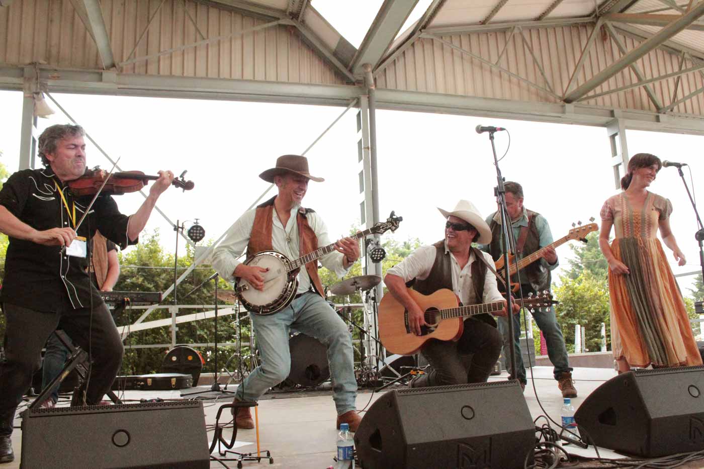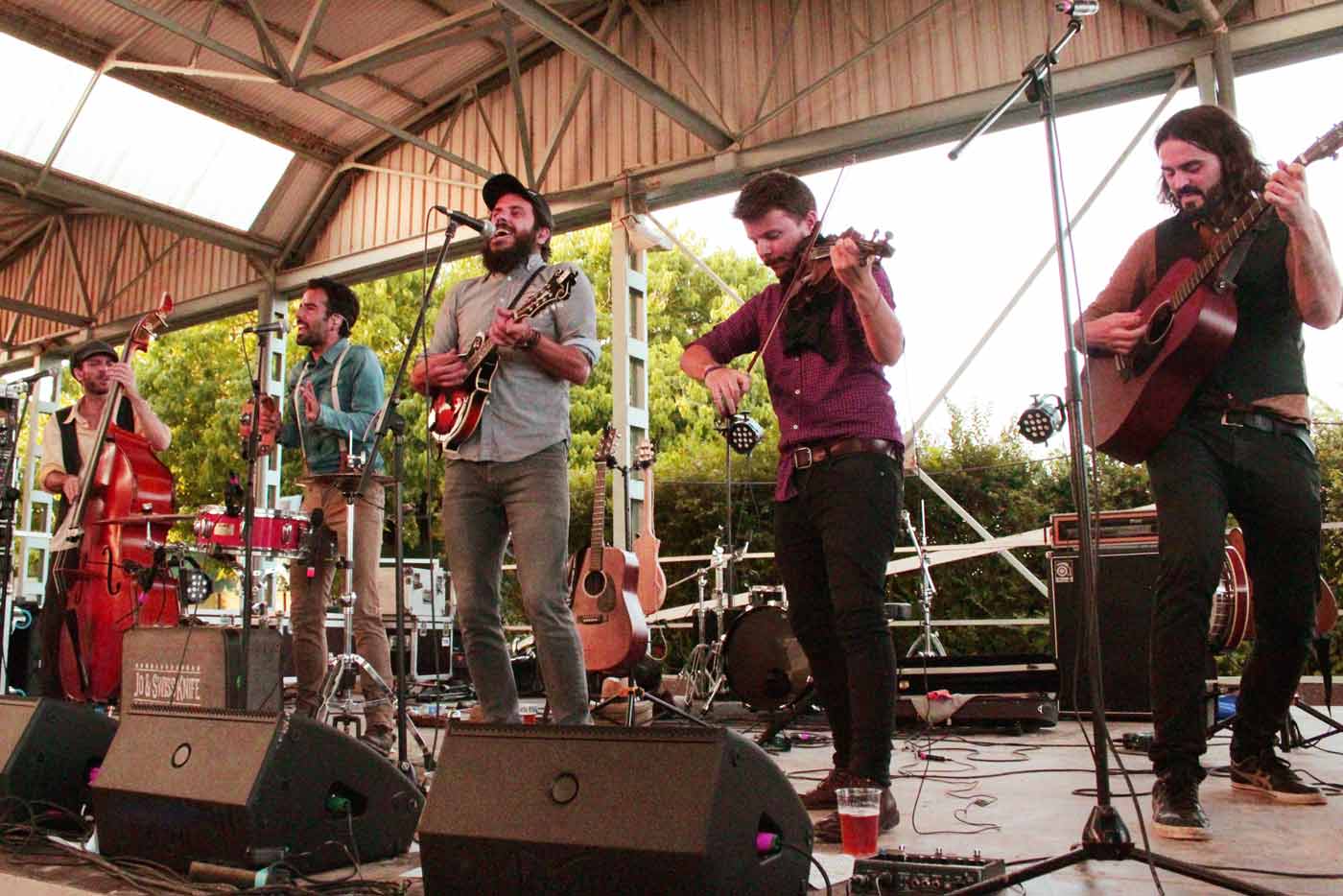 Puestos de comida con opción vegetariana, cafés, gin tonycs, coctails, Jeeps con cráneos de animales en la delantera, Harley Davidsons, una barbería a la antigua usanza y como novedad, dos escenarios: el Roots y el escenario grande donde se dieron la mayoría de las actuaciones. En el recinto había bastante gente por la mañana por lo que una de las primeras bandas, The Old Timey String Band (Foto inferior), tuvo una audiencia espectacular. El festival lo abrieron Catfish Louis & The Washboards Johnny en el Roots y The Greyhounds en el grande.