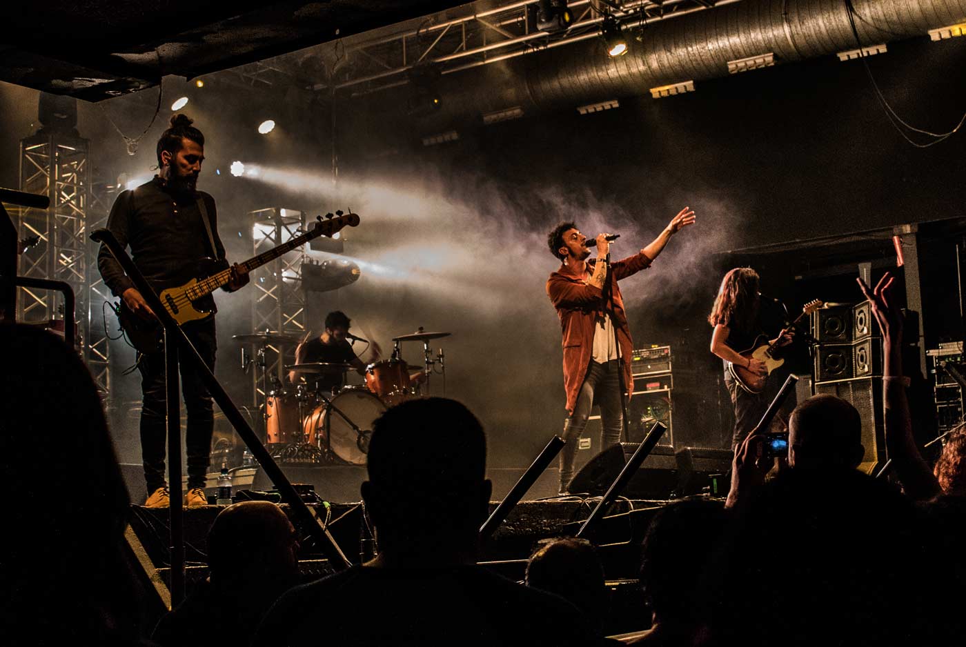 Al acceder a la sala, una trabajadora repartió unas pulseras blancas con leds y sensores de movimiento que parecían activarse automáticamente ¿Cuando?... La expectativa está sembrada. Después de un espectáculo acústico y escucha calmada, aparecieron en el escenario como estelas de luz ardiente los berriztarras Shinova. Un grupo que se está labrando un reconocimiento muy positivo en la escena indie nacional, contrastado con el sold out que hicieron en la Riviera de Madrid el pasado dos de febrero. Los primeros pasos de la banda fueron bajo el paraguas del hard rock, del cual conservan la fuerza en el escenario y la técnica en los riffs (por ejemplo), ya que en ocasiones se distorsionaron y evocaron otros sonidos duros y marcados. Presentan su último disco "Cartas de navegación" pero repasaron cortes de sus anteriores álbumes como hicieron con “Niña Kamikaze” del anterior "Volver" donde el público demostró que se sabía los temas y los iba a cantar. Y así fue.