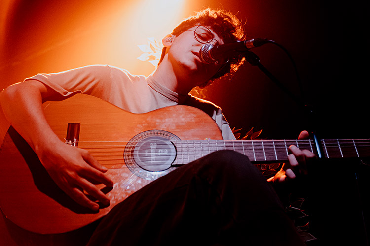Con una escenográfia de la mano de Paloma Lamber, quién creó diferentes espacios con elementos clave dentro del mundo de Socunbohemio (como la silla que aparece en la portada del single “Les coses que no m’agraden de tu”, todo un guiño a Manel), en el escenario se presentaron Artur Viñas (voz, guitarra y piano), Gerard López (guitarra), Òscar Acón (batería) y Biel Colomer (teclados y producción). Formación en la que predominaba una propuesta clásica en la que las guitarras se encargaron de la parte más melódica, junto a los teclados, mientras que la percusión estaba marcada por la batería. Pero no necesitaron más. La delicada voz de Artur Viñas llenó la sala para recibirnos con “Conte de les 4 estacions“ en una primera parte en la que nos mostró la diversidad de sus registros que fluyen entre el folk, el pop y el indie. El cantautor catalán interpretó en una primera parte del show más dinámica la nostálgica “Ses paraules s’emporta el vent”, la pinkfloydiana “Som tan petits”, “Conte de primavera” y la espléndida “Somni d’una nit d’estiu” para sumergirnos de pleno en este nuevo proyecto. Con una audiencia eufórica al escuchar el inicio de la conocida “Júlia”, el local se llenó de coros uniformes para interpretar la canción de uno de los personajes más frecuentes dentro de la discografía de Socunbohemio.