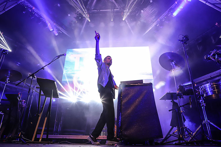 Acosta juega en casa y se nota la emoción de este inicio de gira en el ambiente, su disco es un homenaje a esta isla de fuego (es de aquí al lado, de San Bartolomé) y no podría haber mejor marco para su puesta de largo. Sale a escena y hasta los volcanes dormidos rugen para recibirlo, acompañado en las alas de la nave por Xerach Peñate a las percusiones, teclados y coros, y Carlos Sosa a la percusión. Recorren cada surco de “El Porvenir”, de las cautivadoras y muy coreadas “Ceniza” y “Famara”, mágica playa a la que teletransporta a las casi 3000 personas que vibran y bailan en cada interpretación, pasando por las otras dos piezas colaborativas del álbum, la onírica “Al límite” y una “El Cerro y el Mar” que sube las pulsaciones del directo. Las voces sampleadas suplen sin problema a los artistas invitados en cada una de estas cuatro canciones (Valeria Castro, Depedro, Juancho Marqués y Çantamarta), que por agendas no pudieran estar presentes. Las que sí estuvieron sobre las tablas, fundiendo electrónica con baile, colores y carnaval, fueron Las Revoltosas de San Bartolomé (mujeres pioneras que consiguieron ser la primera murga femenina de Canarias), con sus trajes de pura fantasía para la ocasión y disfrute del público. Porque “El Porvenir” es eso, Lanzarote, su gente auténtica y su propia historia.