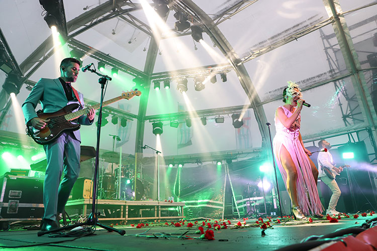 Descorche de botellas sin pausa y repiten La Habitación Roja, esta vez en las alturas y regalándonos un concierto especial para la ocasión, tocando de principio a fin uno de sus discos más celebrados, “Fue eléctrico” (12). Vino va y vino viene y, con el eco de una “Indestructibles” que seguirá resonando entre volcanes durante mucho tiempo, nos dejamos llevar y sin darnos cuenta, nos vemos inmersos en la parranda más esperada con Fuel Fandango, quemando las naves sobre un escenario coloreado por un mar de claveles rojos. Nita, enmascarada y radiante, baila bajo un trance resplandeciente y tarda pocos parpadeos en extender su hechizo sobre La Geria al completo, con Alejandro Acosta entregado en cada pista, al bajo y teclados, emocionante y emocionado por jugar en casa. Es de la vecina San Bartolomé y nos cuenta que de pequeño él venía a vendimiar con su familia a estas tierras. La luminosa enredadera de neones, de electrónica y raíces, se extiende por cada palmo del terreno, recalentando como lava ardiente el suelo y haciendo que no quede un alma sin bailar. De lo más granado de su repertorio, a adelantos de su esperado EP “Romances”, hasta llegar a la erupción final con ese tridente explosivo que va de “Toda la vida”, a “Salvaje” y “Huracán de flores”.