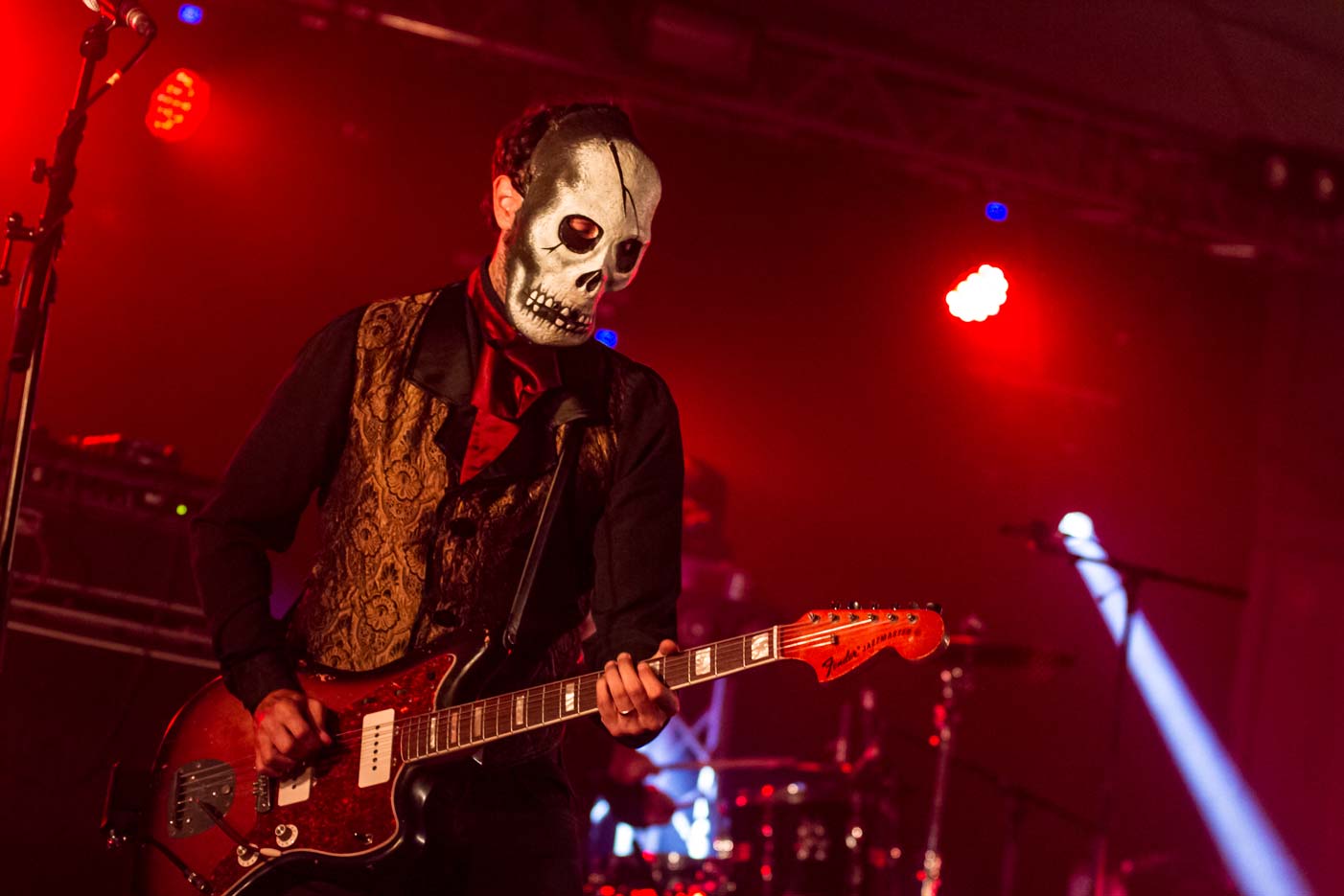 Tiene mérito tocar durante un set frenético –más de una veintena de temas en algo más de una hora-, pegados a esas máscaras de plástico que no se desajustan ni en un descuido. El sacrificio merece la pena: el misterio en torno a las identidades de a pie de El Bravo, El Jíbaro, El Dorado y El Caníbal atrae y ensalza su magnetismo, al tiempo que les resta ego. No logo. Sobre el escenario, no hay ni bueno, ni feo ni por supuesto, malo. La imbatible “Patada Trueno” tiene como culmen un castellet con el que estos jinetes del Apocalipsis reciben una gran ovación. Son unos “Locos sobre ruedas”, perfectamente alineados a las cuerdas, coreografía de mástiles en alto y swin canalla de caderas. “Hacer esto es difícil, no vayáis de listos”, advierten. Tan divertidos como el videoclip de esta canción, a bordo de “bólidos supersónicos”. Llega el primero de sus habituales numeritos: El Bravo abandona su batería, supuestamente enfadado porque, según explica el guitarrista y maestro de ceremonias El Dorado, “sólo hay 20 personas bailando y un borracho”, señalando al que será el próximo objetivo de su… ¡Sacrificio! Los presentes corean “¡Sa-cri-fi-cio! ¡Sa-cri-fi-cio! ”, y pronto aparece una colchoneta rosa a medio hinchar con la que el borracho ya no tan anónimo surfeará sobre el público. “El Barón Rojo” es una apisonadora de actitud, que surtirá efecto para, poco después, organizar la clásica Tiki-conga. “Edith”, con sus aires de amor de verano que se desvanece con la vuelta al cole, brinda algo de sosiego, aunque esto ya no hay quien lo pare, y lo saben. “Bailad, malditos”, parecen decirnos, sin mediar palabra alguna. Sobran las letras. Reparto de Tiki-máscaras y bises desquiciantes con la hilarante versión del “Take On Me”: “Tiki On Me” desata (aún más) al público. Digna sombra de The Shadows y herederos de la efervescencia surf-rock, una espera que aparezca Link Wray de pronto y se les una a la fiesta. Si no te revitalizan los Tikis, háztelo mirar. Nos vemos en el volcán.