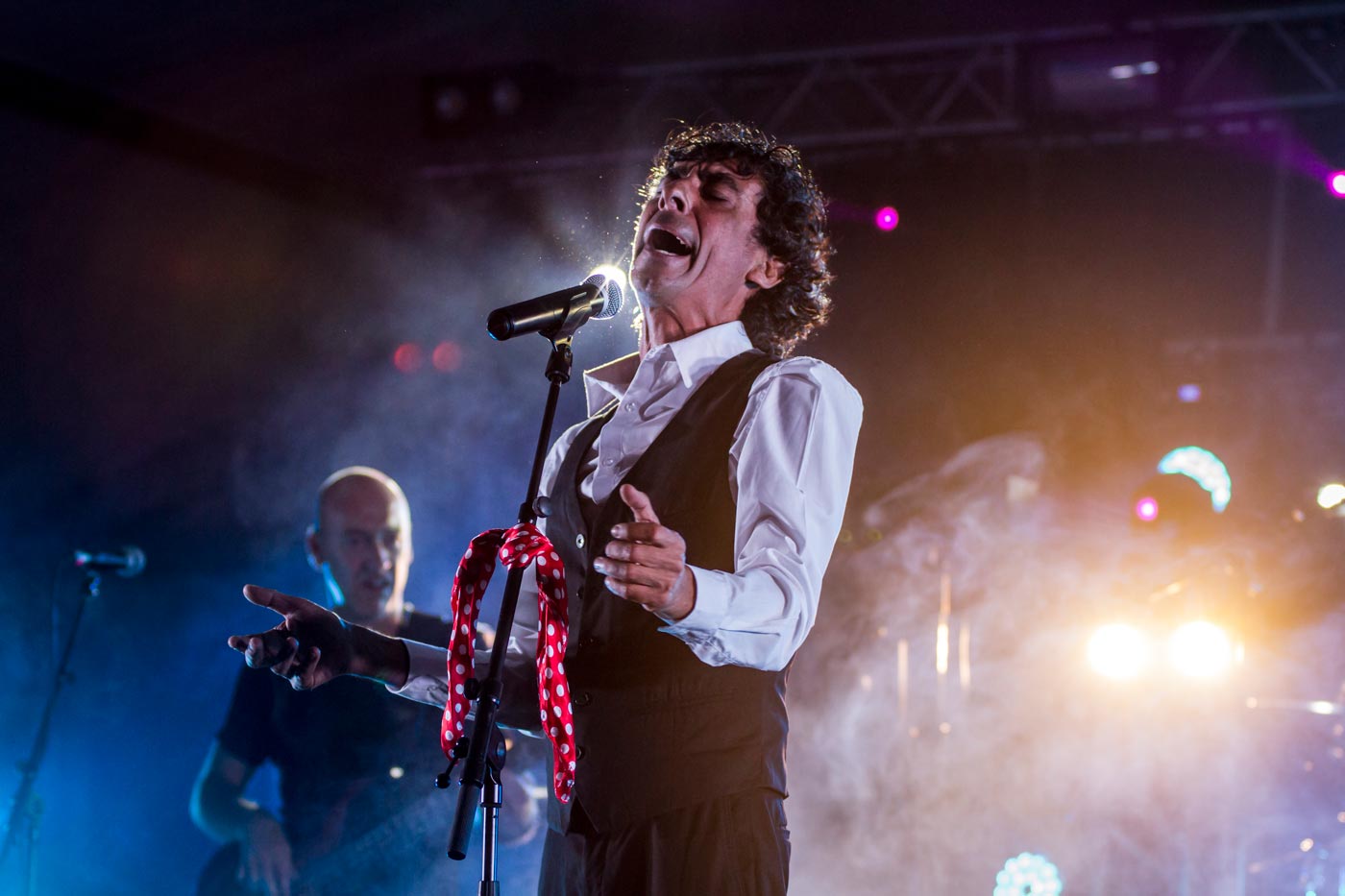 Con Tomasito (foto superior y encabezado) llegó el escándalo. Viene hecho un pincel. Flamenquito enjuto sin un gramo de grasa ni vergüenza, zapatos verde esperanza. El recinto está a rebosar, expectante ante este Ciudadano gitano que viene de Cádiz con ganas de repartir alegría de vivir y camaradería sin fronteras. ¿Cómo no venirse arriba con alguien que suelta, pizpireto y locuaz, “¡Viva la fiesta! ¡Gora! ¡Gora!”?. Poco más necesitará para meterse al público en el bolsillo. Tiene mucho arte y más guasa. “¡Vaya caras de felicidad tenéis, os dura el moreno!”. Presenta su antología gitana, con temas amenos y pegadizos como “Libre y a mi manera” –“Pues eso tenemos que hacer, ¡vivir a nuestra manera!”, anima-, “Bandolero” o “La Cacerola”. Curiosa estampa la de algunos parroquianos de marcada estética abertzale, bailando descosidos “Oh Mare”. ¡Olé zu! Tomasito viene muy bien acompañado con una banda que se desenvuelve con sólida soltura tanto en la guitarra española como en la eléctrica. Puro teatro por bulería en “Soy un limón”. Sólo él es capaz de calzarse una mochila con el escudo del Real Madrid, comparar al Athletic de Bilbao con los langostinos de Sanlúcar de Barrameda y salir airoso. Arte y entendimiento. Tomasito descongestiona el procés y la nueva guerra fría Trump vs. Kim Jong-Un en dos tardes. Y le sobra tiempo para irse a la freiduría (“El vino y el pescao”), tema que surge, cuenta, un día en que Kiko Veneno quería trabajar, mientras que los Delinqüentes y él no estaban por la labor, precisamente.