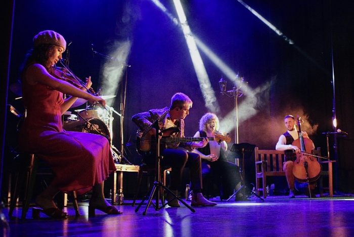Recién llegados de la gira “Música en cada rincón” con la que han pasado por los pueblos más pequeños de la península, en esta ocasión, de la mano del ciclo Girando por Navarra, Suakai tiene preparado un espectáculo de versiones, donde seis músicos, distribuidos entre; violín, chelo, percusión, bajo eléctrico, guitarra española y voz, desgranan los temas elegidos, junto a un calculado juego de luces y una escenografía preparada para la ocasión. El attrezzo urbano y una iluminación cálida contrasta con los juegos de luces y las entradas y salidas de los músicos en escena, lo cual nos hace introducirnos en el relato de una ciudad imaginaria en la que el encuentro entre los músicos que la habitan da lugar a la propia interpretación musical del repertorio.