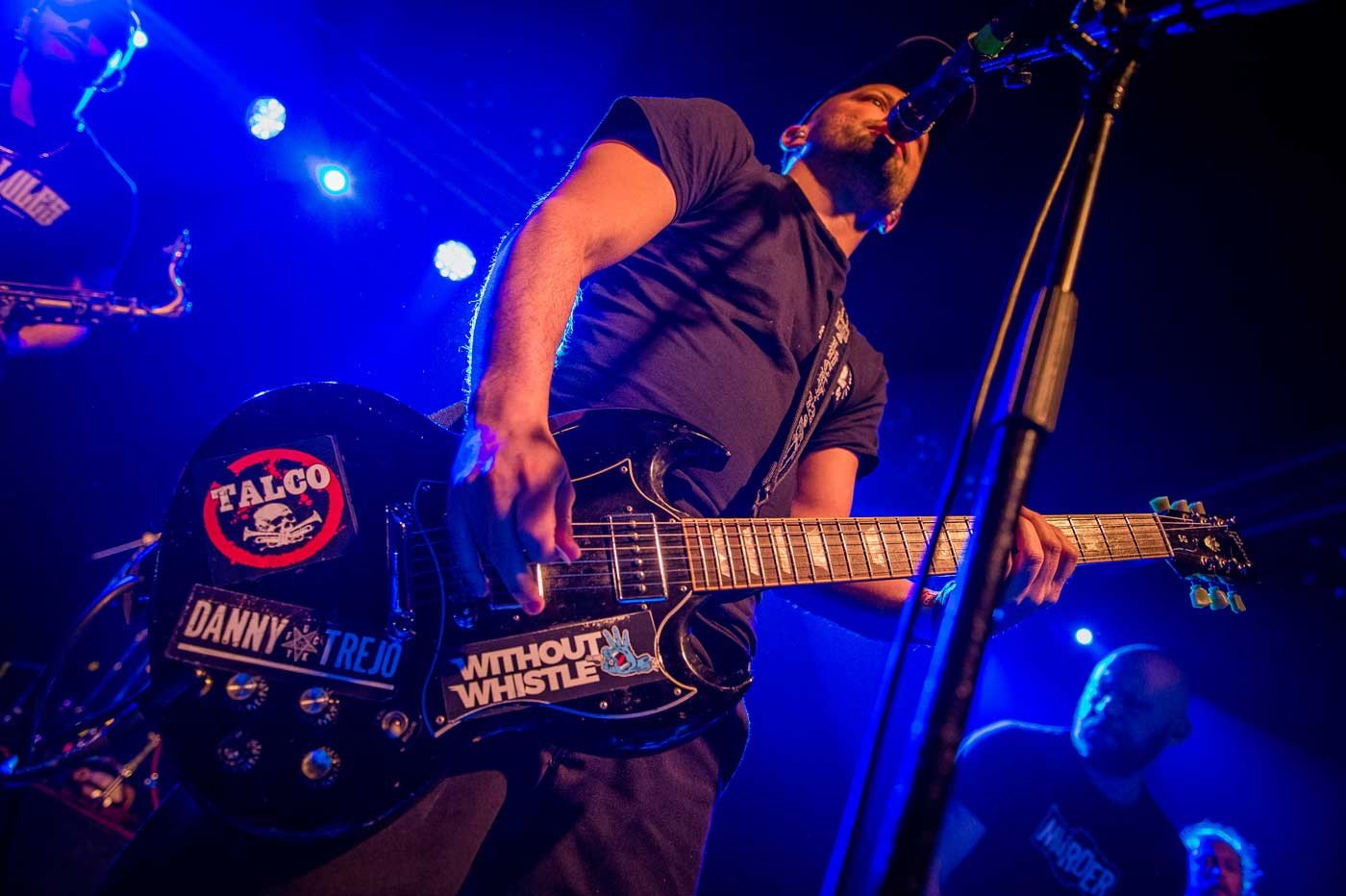 El himno de la CNT “A las Barricadas” recibe a los integrantes de la banda barcelonesa Ebri Knight cuarenta minutos después de la apertura de puertas de la sala. La atención del público era fervorosa y cuando terminó el audio, golpe de luces y el tema “Carnaval” del nuevo álbum abrió el bolo. Este grupo barcelonés está presentando su cuarto disco "Guerrilla" (Maldito Records 2018) que mezcla folk y punk con melodías bélicas, contenido antifascista y de lucha por unos ideales políticos y sociales que movilizaron a la sala por un sentimiento común. -Al fascismo no se le contesta, ¡se le combate!- clamó la voz principal de Arnau Aymerich, y el público se volvió loco.