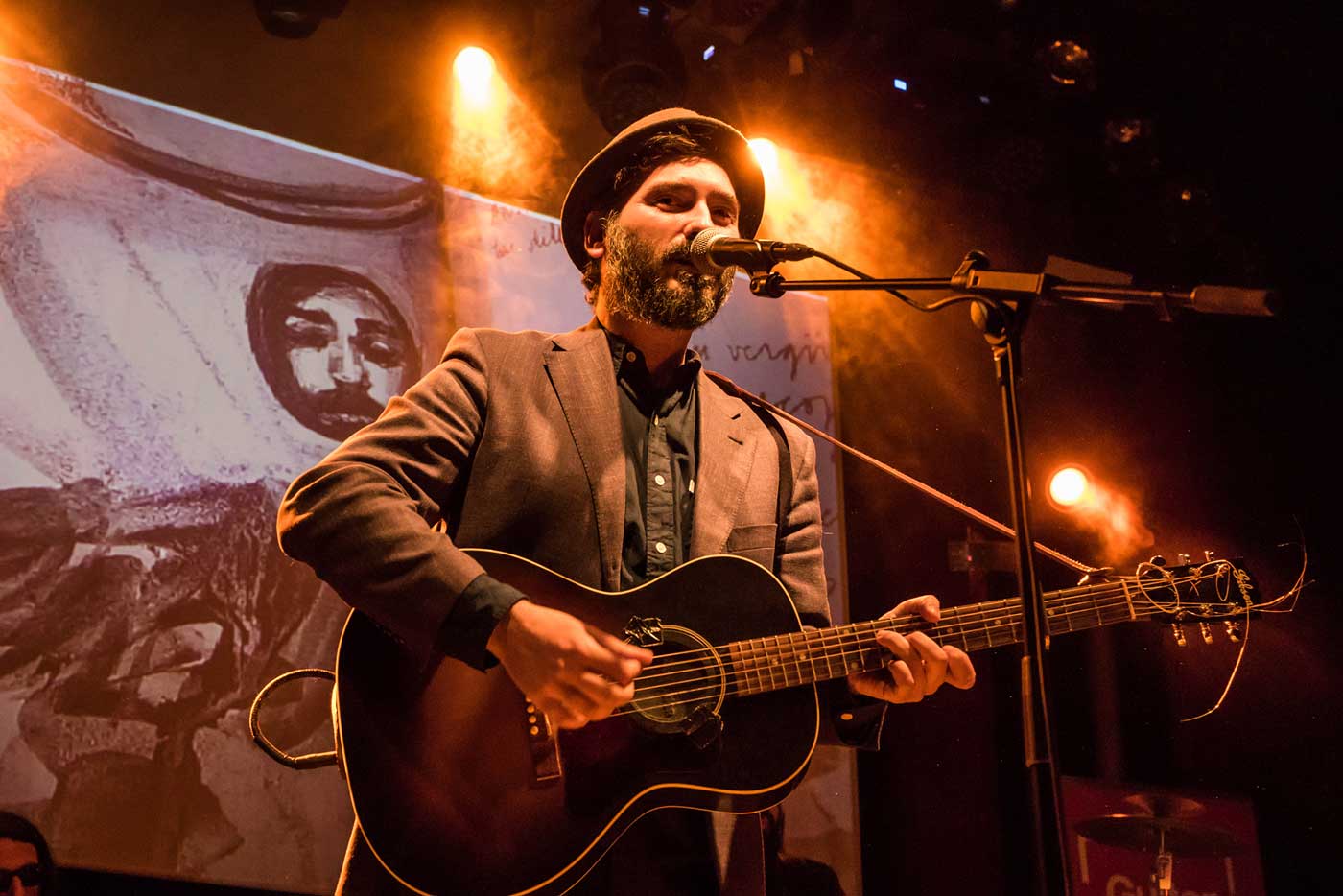 Pero una celebración necesita invitados y, sin ir más lejos, los primeros en salir lo hicieron en forma de teloneros. Invisible Harvey, el proyecto personal de Dimas Rodríguez, (guitarrista de La Banda Municipal del Polo Norte que el año pasado publicó su debut “La puerta giratoria” (El Genio Equivocado), se presentaron como una extensa banda muy compacta, con unos elaborados arreglos instrumentales sumados a una sección de cuerda (violín y chelo) que da mucha profundidad de campo a esta propuesta que cuenta historias insólitas, con toques de humor y pasión narradas por un exultante Dimas, que estaba muy ”onfire” encima del escenario contagiando su buen hacer a todos.