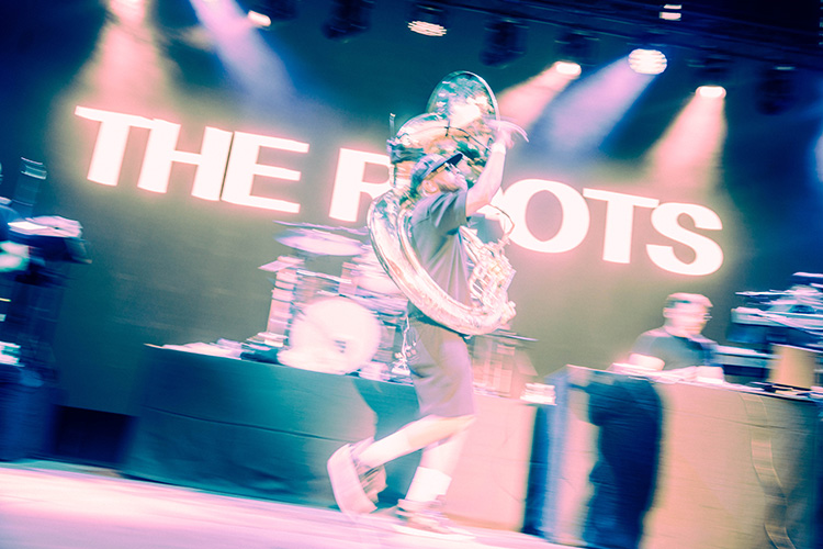Puede que The Roots sea una banda de hip hop, y no una cualquiera, posiblemente estemos ante una de las diez mejores agrupaciones del género, pero trascienden los límites del mismo porque son una banda en todos los sentidos, y es que The Roots no son solo dos tocadiscos y un micrófono, sino una banda en el sentido tradicional del término, una que toca (y cómo lo hacen) sus propios instrumentos. Son nueve alli arriba, saxofón, trompeta, tuba, guitarra eléctrica, bajo, teclados, un DJ que toca también una batería electrónica y, por supuesto, Queslove a la batería y Black Thought como maestro de ceremonias.
