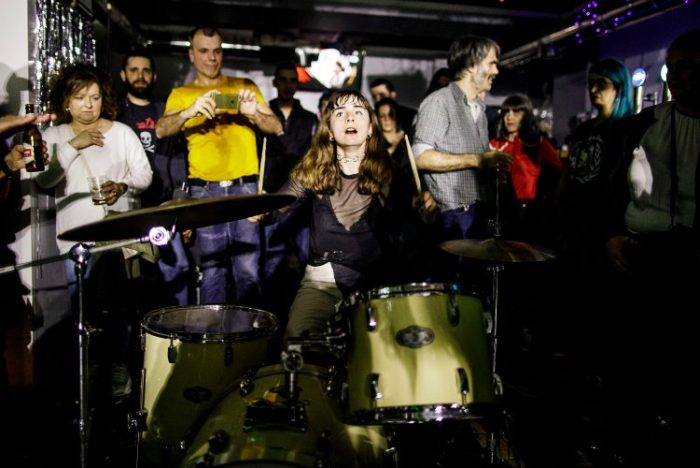 Axelle se pone a desmontar la batería y regalarla a la gente que hace cadena para bajarla del escenario, ordenados como los vecinos en un incendio pero con los baldes llenos de alcohol, que aquí todos quieren avivar la llama y que no se apague. Con la batería ya en el suelo, Ana toca el bombo, el otro los platos y aquel la caja. En el escenario, quedan los otros dos miembros, que también son presas de un público que ha borrado todas las líneas. Alguien al que no invitaron le tienta las ondas electromagnéticas a la nunca del theremin. Je suis désolé, pero ya no hay vuelta atrás. La cosa se desmadra y la banda se arranca sin avisar con el “Where’s Captain Kirk?” de Spizzenergi. Con los chicos, al escenario, se ha encaramado el maestro de ceremonias, Andi Sinclair de Los Retumbes, que aún luce su bonita chaqueta color burdeos de tres botones y confección de sastrería y sus Ray-Ban, pero ha perdido la cerveza y el gorro de fez que le servían de uniforme de trabajo. Ahora, comparte micro con Rémy para vociferar la pregunta del estribillo. Otro espontáneo, el mencionado anteriormente Mikel Actitud, también sube a la tarima y con pintas de sindicalista en acción esgrime uno de los dos carteles gigantes que, durante todo el bolo, se han paseado por la primera fila, al estilo de la cartelería reivindicativa en las protestas antibélicas de los 60, pero con más acidez y acierto aún. En uno se leía “Menos postureo” y en otro “Más meneo”, que es algo que, muchas veces, se te pasa por la cabeza cuando te acercas a la capital, pero aquí no, no hacía falta, aunque funcionó como demostración de intenciones. Ya solo queda el primer cartel, que lo muestra Mikel con empeño, porque el segundo lo destrozó Andi contra el suelo, emulando a Paul Simonon con el bajo. La peña baila al son de Spizzenergi vía Silly Walks sin que les importe una mierda donde está el capitán Kirk porque ellos quieren estar aquí y ahora, ahí y entonces. Y así se llega al final, que había que llegar.