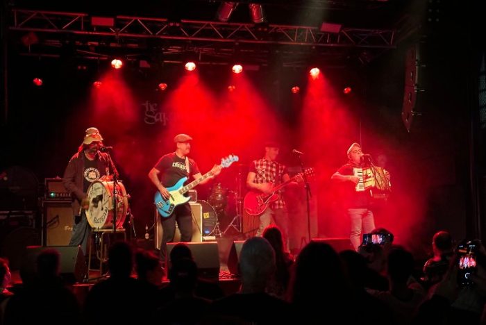 De algunos miembros de la txaranga JoTaFa surge The Sakamantekas. Talde musical originaria de Agurain pero con ramificaciones en otros pueblos de Lautada como Heredia y extendiendo sus tentáculos hasta Urbina. Incluso hay rumores de que gente de Ozaeta está colaborando en las ácidas letras de sus canciones. Pero no dejan de ser rumores. Lo investigaremos. Lo que es absolutamente cierto es que una legión de seguidores y simpatizantes venidos desde la Llanada y Mendialdea esperaban impacientes ya desde la hora prevista de inicio la salida a escena de este combo. La sala casi llena ya para ver a los teloneros. Pasados 15 minutos de las 21:00 comienza el concierto-fiesta de los Sakamantekas que en la actualidad lo conforman Jere a la voz y soinua, Axier a las 6 cuerdas y voz, Pablo al bajo y Sergio en el impagable trabajo de percusión y coros. Este es el núcleo duro de The Sakamantekas aunque en esta ocasión se ven perfectamente acompañados por dos laguntzailes de lujo: Andoni Cabello a las teclas al principio del bolo y Mikel Goikuria en el violín en buena parte de la actuación. Desgranan sus 2 trabajos editados hasta la fecha: su debut homónimo (2021) que se presenta en una bonita caja de huevos camperos km. 0 y el reciente "Edo Bi" (2023) presentado como una edición de un Egin ochentero. Temas irónicos, risas, reinvindicación y punk-patxanka. Mucha patxanka. Alguien decía que últimamente el espíritu tijuanero había desaparecido de nuestros escenarios. Pues bien, The Sakamantekas lo han recuperado en toda su plenitud. "Corrido De La C15" lo más celebrado entre la parroquia y un apoteósico final con su "Higway To Hell" adaptado a nuestra realidad cierra el bolo. Seguirán actuando en pueblos y bares. Diviértanse.