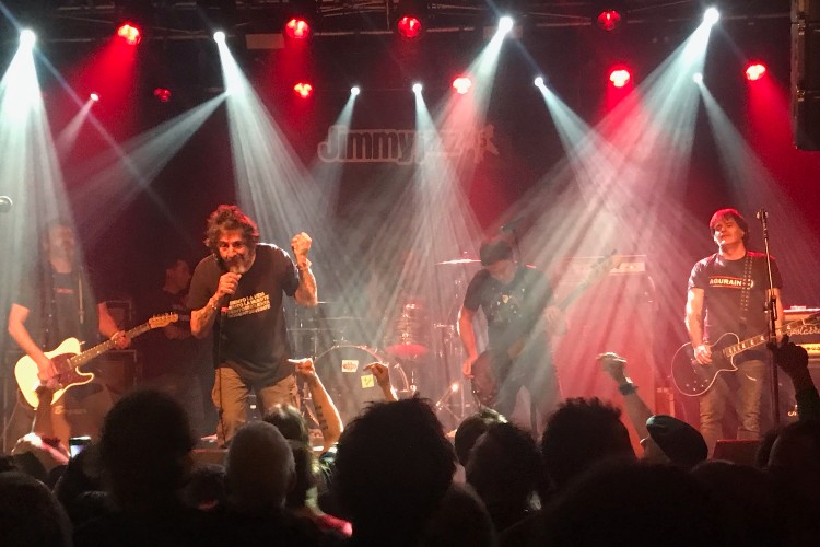 Y pasados apenas 15 minutos de la finalización del bolo de los Sakamantekas (la verdad es que esta rapidez se agradece bastante) ya tenemos sobre el escenario a Evaristo y su nuevo proyecto: Tropa do Carallo. Mientras el quinteto va tomando posiciones se nos deleita con una alegre tonadilla del sin par Manolo Escobar, al que por cierto Evaristo ya homenajeó merecidamente en su proyecto de 2002, The Kagas. Acompañando a Evaristo en esta nueva andadura tenemos a Abel Murua al bajo, Iker “Tripi” a las baquetas y Alberto Salgado y Kako Disturbio a las guitarras. Un Kako que ya estuvo en el concierto que pudimos disfrutar en el recinto de txosnas de las pasada fiestas de Gasteiz. Sonando "Horóscopo" de Escobar comienza el primero de los 36 trallazos de punk-rock que sin prácticamente descanso nos van a ofrecer esta noche. "Sálvame Patata" pone a botar una Jimmy Jazz llena hasta la bandera. Trallazo de poco más de un minuto que empalman con "O Esclavos", para que no se nos olvide que un “poquito de paranoia viene bien…” y así continuan hasta acabar el primer “bloque” de canciones donde ya van intercalando algún tema que no está incluido en hasta el momento su único trabajo discográfico: "Que Hostias Andáis!" (2022), editado por Desacorde Ediciones, editorial que es también responsable de los últimos libros escritos por Páramos. Trabajo editado en CD y vinilo (éste muy difícil ya de conseguir). "Por Cojones" abre el segundo bloque de canciones donde además de dos temas nuevos, llega la primera canción pollera de la noche: "Tu Alucinas", que empalman con esa maravilla punkarra que es "Bad Religion", de The Kagas, con coros potentes de Abel, Salgado y Kako. La pareja de guitarras se reparten el trabajo de rítmica y solos de manera equitativa durante todos los temas. En "Solo para Españoles" (“yo vivo aquí abajo, lo de arriba es España…”) están especialmente inspirados con un riff acelerado y unos arreglos de guitarra perfectamente encajados. Con Tropa do Carallo las canciones no son tan “espídicas”, abundan los medios tiempos, algunos riffs cercanos al hard-rock y por supuesto con una tesitura de voz más baja en los nuevos temas. "Palidos" es una buena muestra de ello con una estupenda letra inspirada en White Riot de The Clash. Estamos ya en el ecuador del bolo y el calor aprieta, los pogos se suceden y la banda demuestra que es un grupo perfectamente engrasado y rodado. Abel al bajo discreto pero efectivo y la batería de Tripi (casi 20 años acompañando a Evaristo desde que Fernandito nos dejó) tienen mucha culpa de ello. "Por Lo Tonto" es una de esas canciones con estribillo pegadizo y para cantar a viva voz y así lo hacemos. De los momentos más divertidos del bolo.