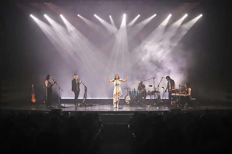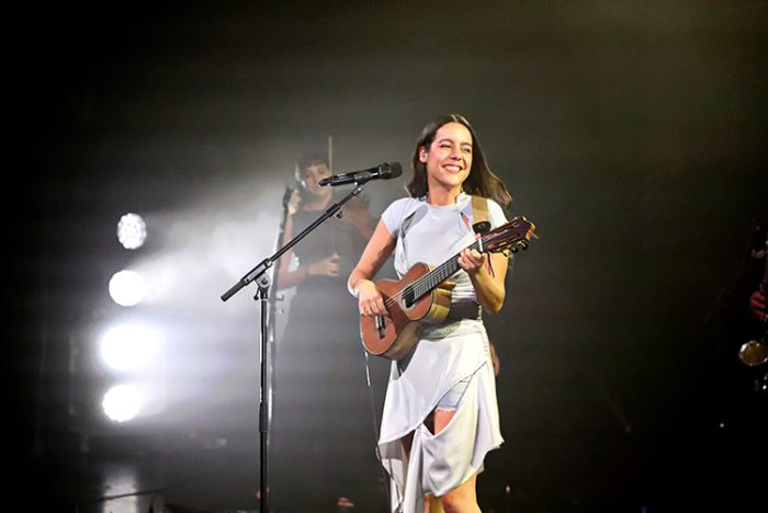 “No puedo deshacer / la garganta, el nudo que me va a romper, / que en el día a día / el aire en el pulmón / no entra como solía…”, y le hacemos frente a “el tiempo que no estés” con Valeria rasgando cuerdas y susurrándonos al oído versos que duelen y sanan al mismo tiempo, con una siguiente flecha que nos impacta, cruje e ilumina en el pecho, acompañada de violín y teclados: “Si algún día se queda la pena en el pecho / tiene que ser suficiente con lo que ya he hecho. / Tiene que dar con lo que hay en el fondo del alma, / que es la que hoy, mañana y siempre mantiene la calma…”. Oasis de luz con la maravillosa interpretación de la “Hoxe, mañá e sempre” que grabó junto a Tanxugueiras y que hoy borda junto a María de la Flor y Meritxell Neddermann; un estar sin estarlo, un “No está aquí, mamá, / no está, no está aquí, no, no. / No está aquí, mamá, / solita estoy yo”, que rompe en alegría de palmas y canto colectivo por un público rendido y agradecido.
