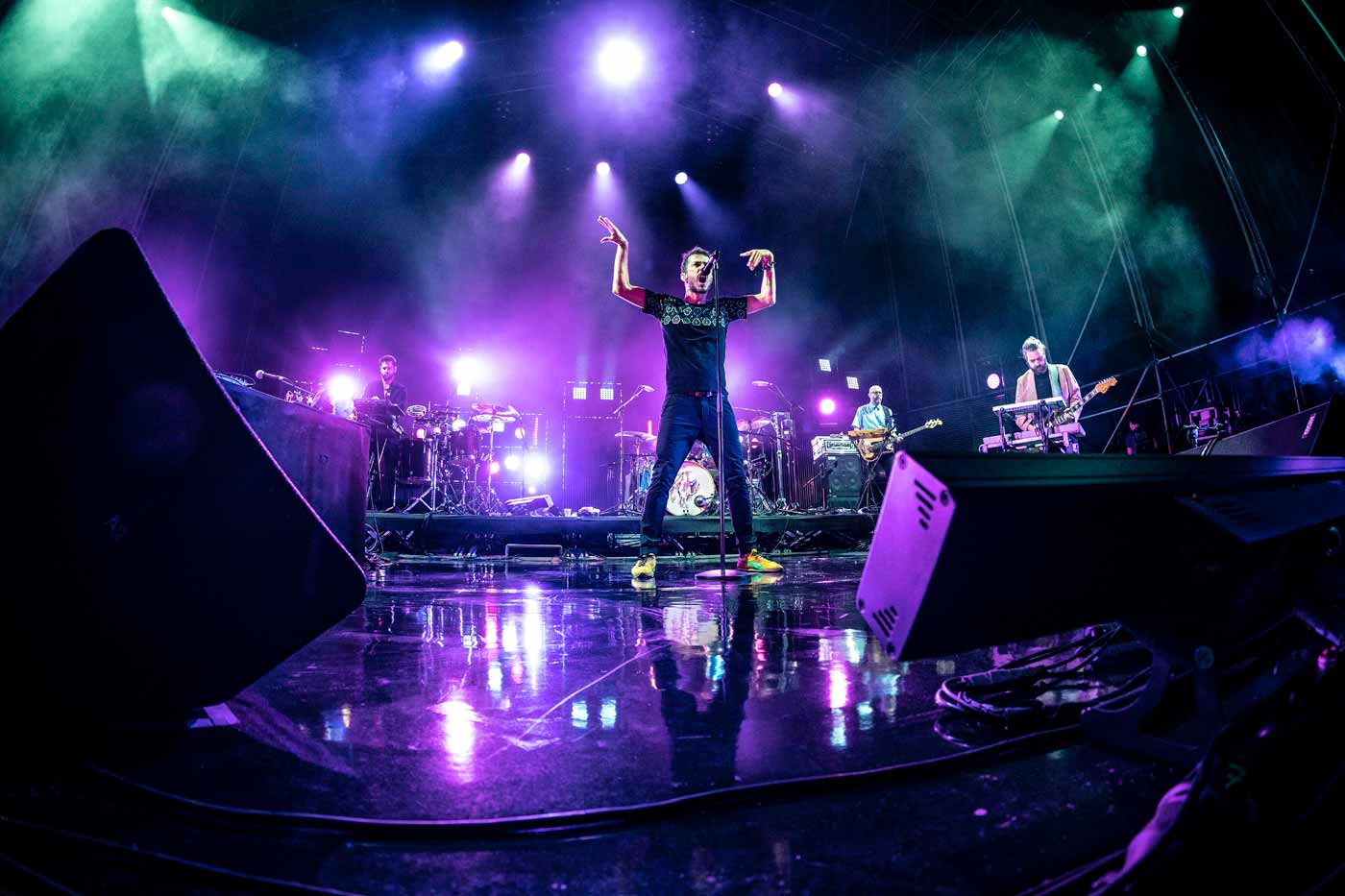 Y esa otra cosa se llama Vetusta Morla. Los de tres cantos están celebrando su veinte aniversario y venían presentando su último “Mismo sitio, distinto lugar”, arrancaron con cuatro temas nuevos destacando los visuales de “Palmeras en la Mancha” en forma de comic pero tampoco terminaron de calar en un concierto que fue de menos a más: Con “Golpe maestro” dieron el primer puñetazo en la mesa. Pucho su cantante pidió disculpas por los problemas generados por la competición de saltos y los retrasos. Encandilaron a los corazones rotos con una “Maldita Dulzura” que confieso nunca me ha entrado. Y desde ese instante concatenaron un montón de momentazos , desde los brillantes retazos instrumentales de “La vieja escuela” y “Punto sin retorno”, la delicadeza de “Al respirar” o las guitarras distorsionadas de “La Deriva”. A destacar el estado de gracia de una banda con un batería David Indio, brillante y con muchísimo Groove. Unos músicos muy versátiles, Galvan, Latorre y Baglietto, simultaneando bajos o guitarras con sintetizadores o pianos y coros. Pucho cantó muy bien y ejerció de chamán con sus movimientos frenéticos constantes. A destacar los visuales y las luces muy trabajadas para cada canción. Y con mensaje en euskera incluido “nos han dejado vivos” leía el cartel.